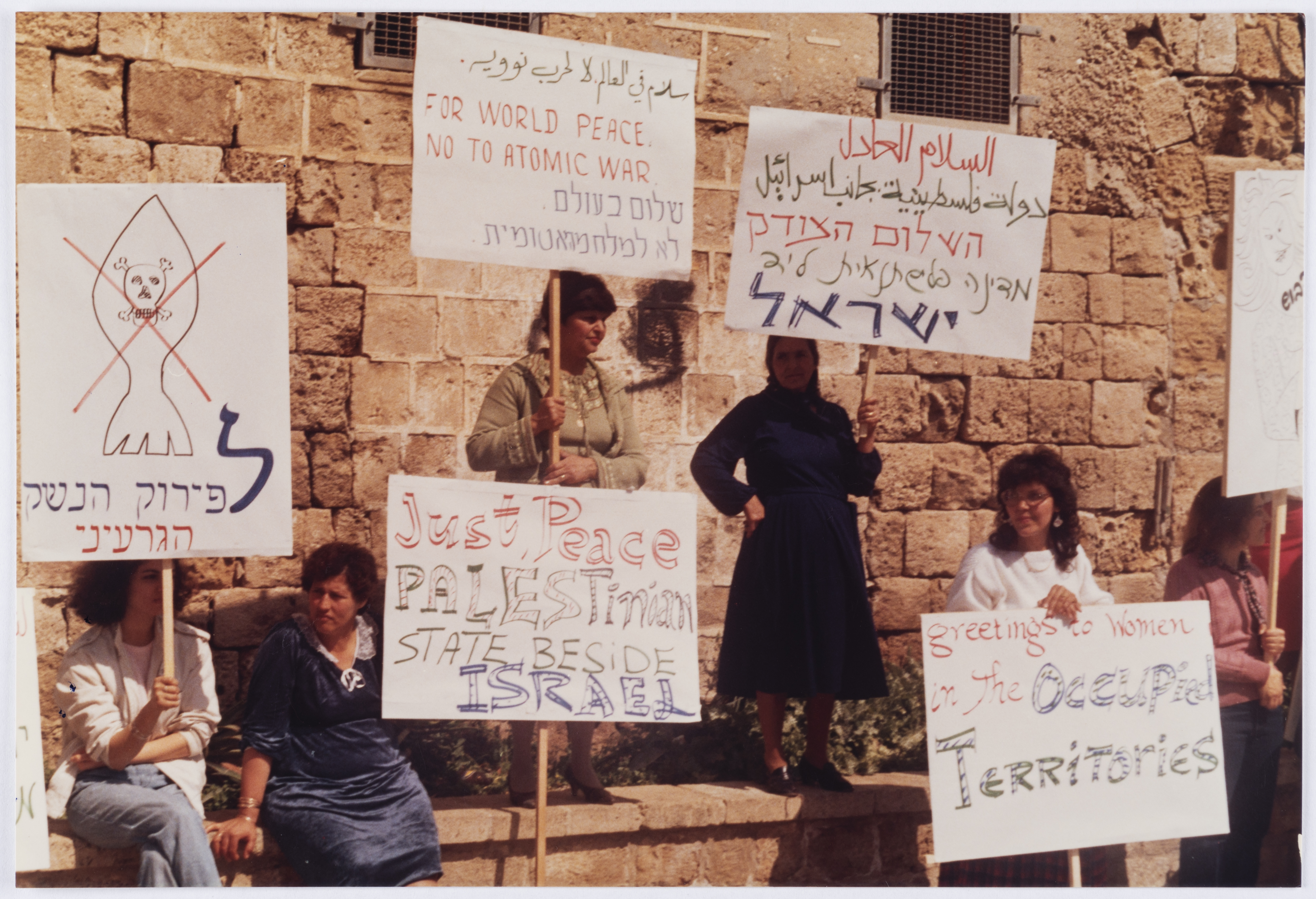 صورة ملونة، تظهر فيها مجموعة من النساء يحملن لافتات مكتوب عليها شعارات"السلام العادل ددولة فلسطينية بجانب اسرائيل" "سلام في العالم لا لحرب نوويه" وشعارات اخرى باللغة العبرية والانجليزية اثناء مظاهره 8 آذار عام 1986