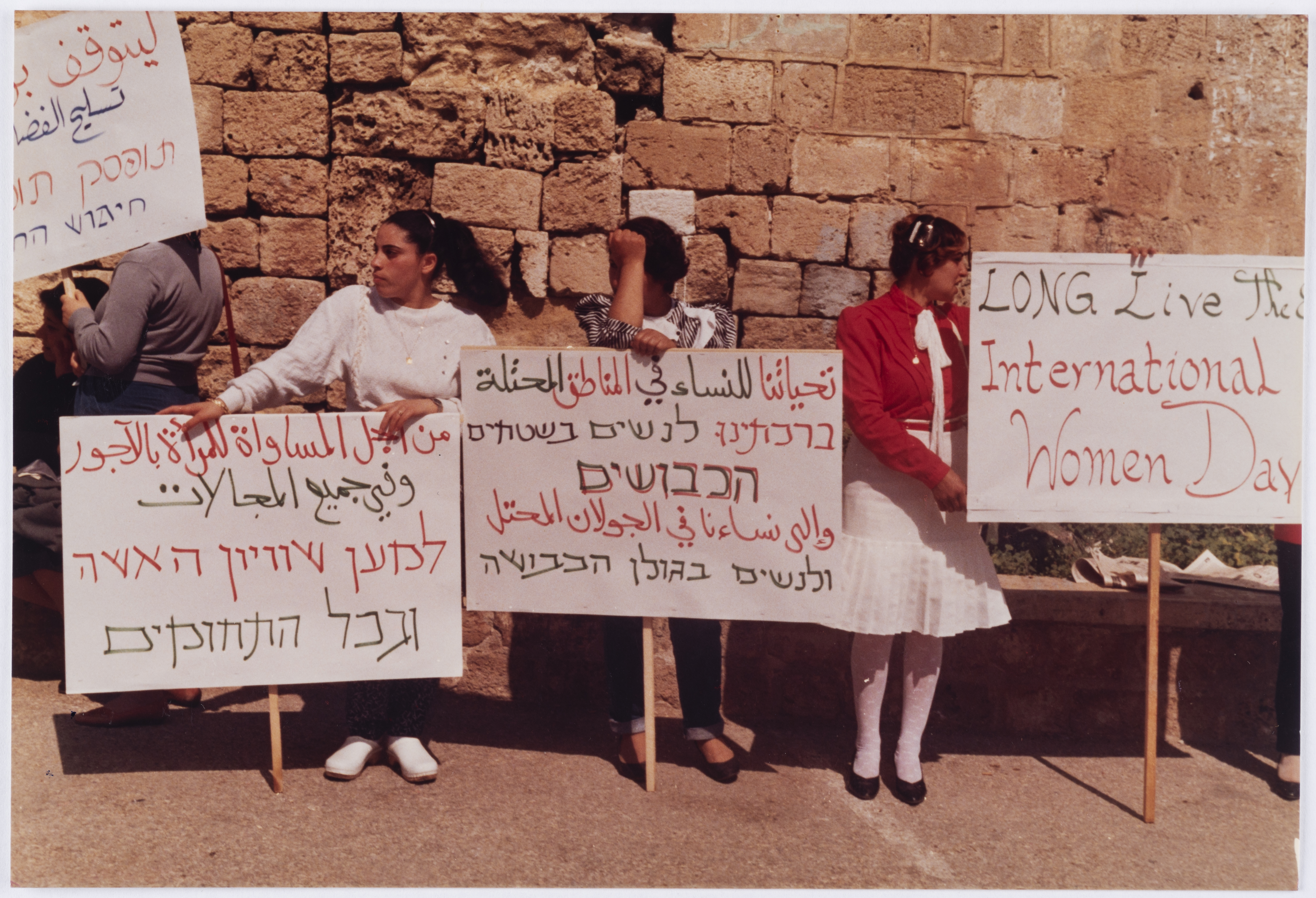 صورة ملونة، تظهر فيها مجموعة من النساء يحملن لافتات علهيا شعارات "تحياتنا للنساء في المناطق المحتلة والى نساء في الجولان المحتل" "من اجل المساواة للمرأه بالاجور وفي جميع المجالات" اثناء مظاهره 8 آذار عام 1986
