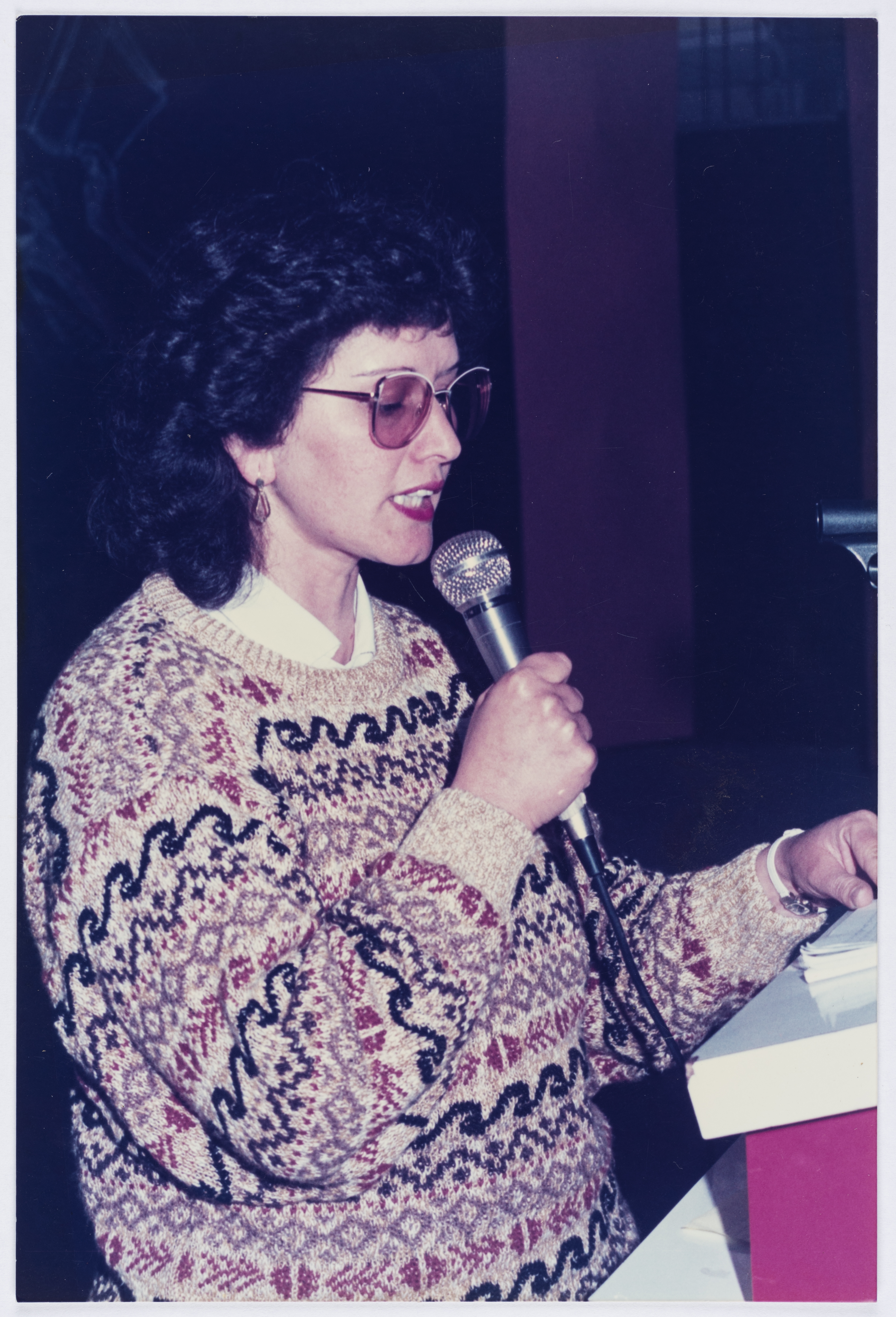 .صورة ملونة، تظهر فيها فتحيه شاهين الصغير عضوه سكرتاريه حركة النساء تلقي كلمه الحركه اثناء مظاهره الثامن من آذار