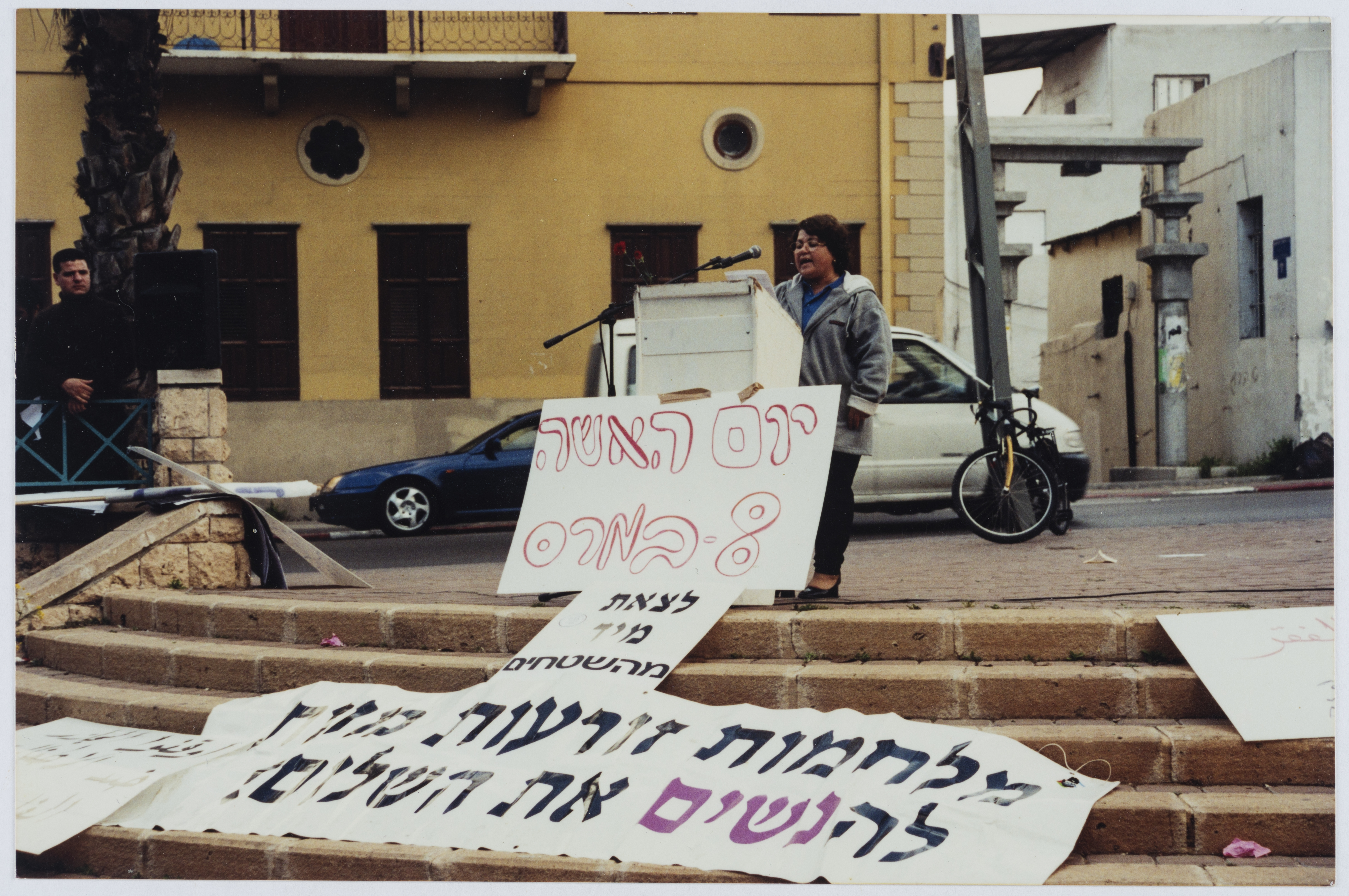 .صورة ملونة، تظهر فيها إمراه تلقي كلمة اثناء مظاهرة 8 اذار عام 1999 في يافا