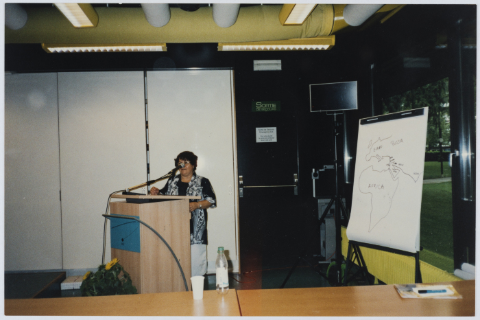 صورة ملونة، تظهر فيها فتحيه عوايس مندوبة حركة النساء في جمعية ويلف نساء من اجل السلام والحرية تلقي كلمة في جنيف عام 2001