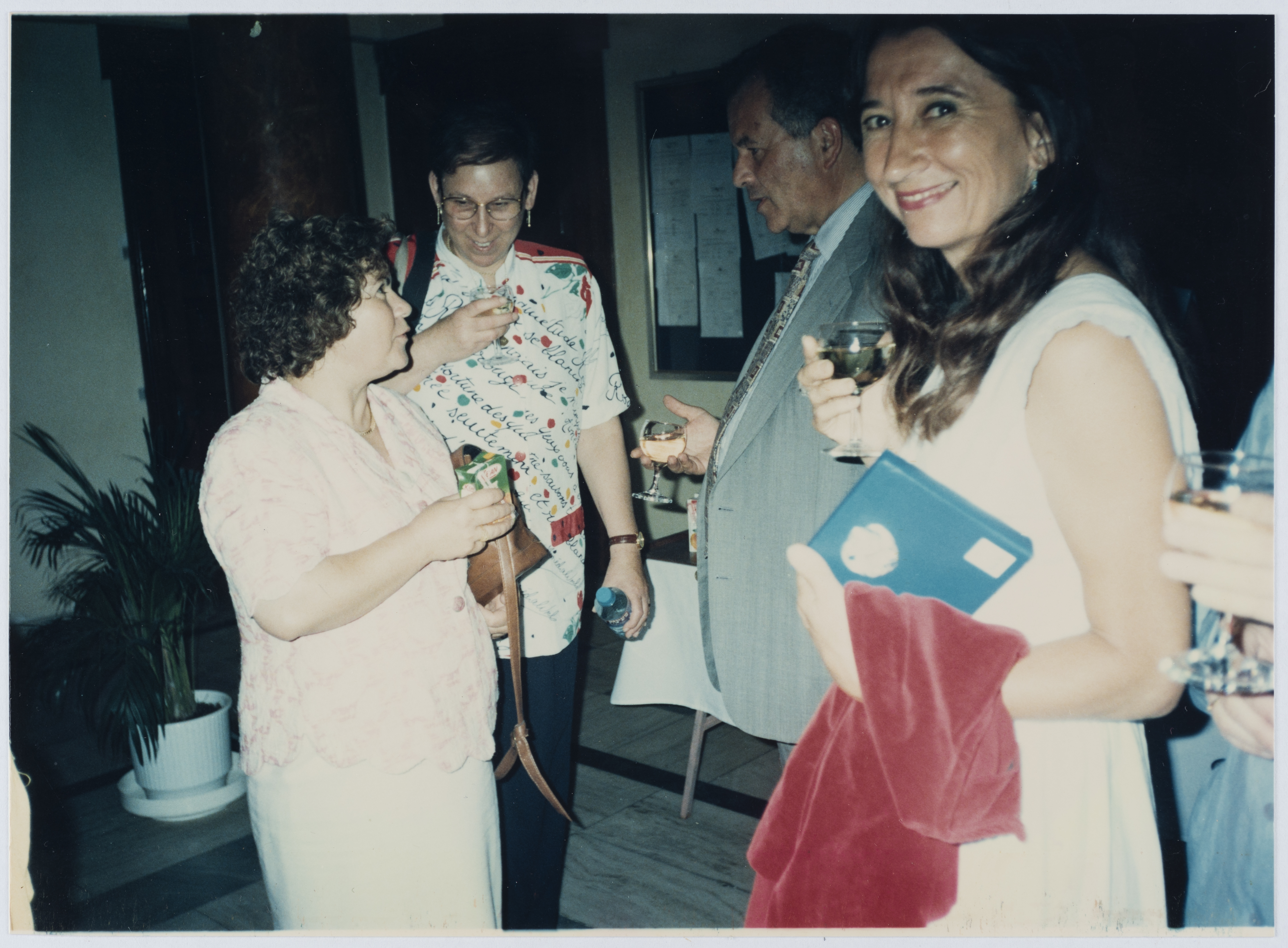 صورة ملونة، تظهر في الصورة يانا منتوف رئيسة جمعية نساء حوض البحر ونافا أليشاول من جمعية بنت السلام وفتحيه عوايسة من حركة النساء الديمقراطيات اثناء مؤتمر نساء حوض البحر المتوسط عام 1996