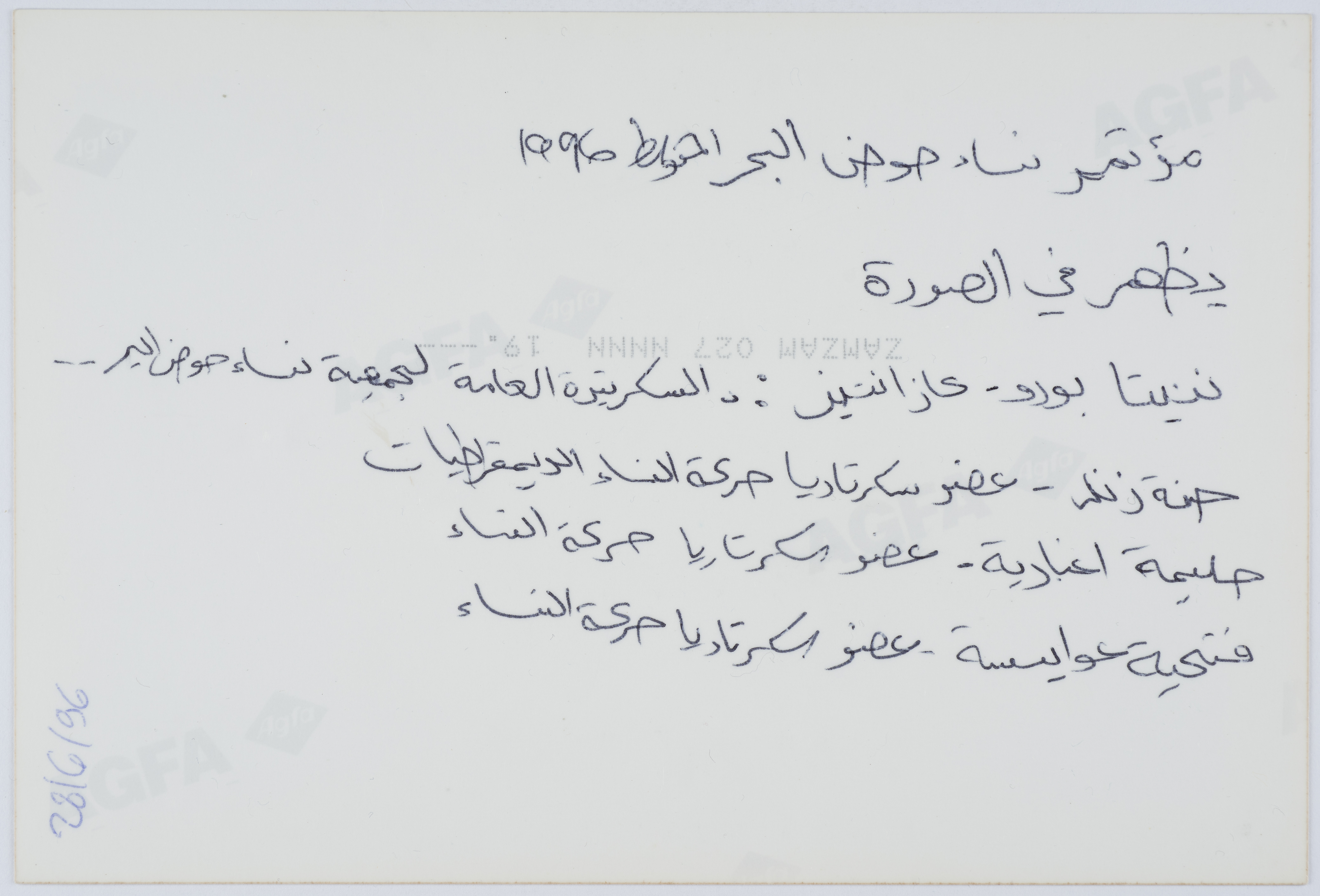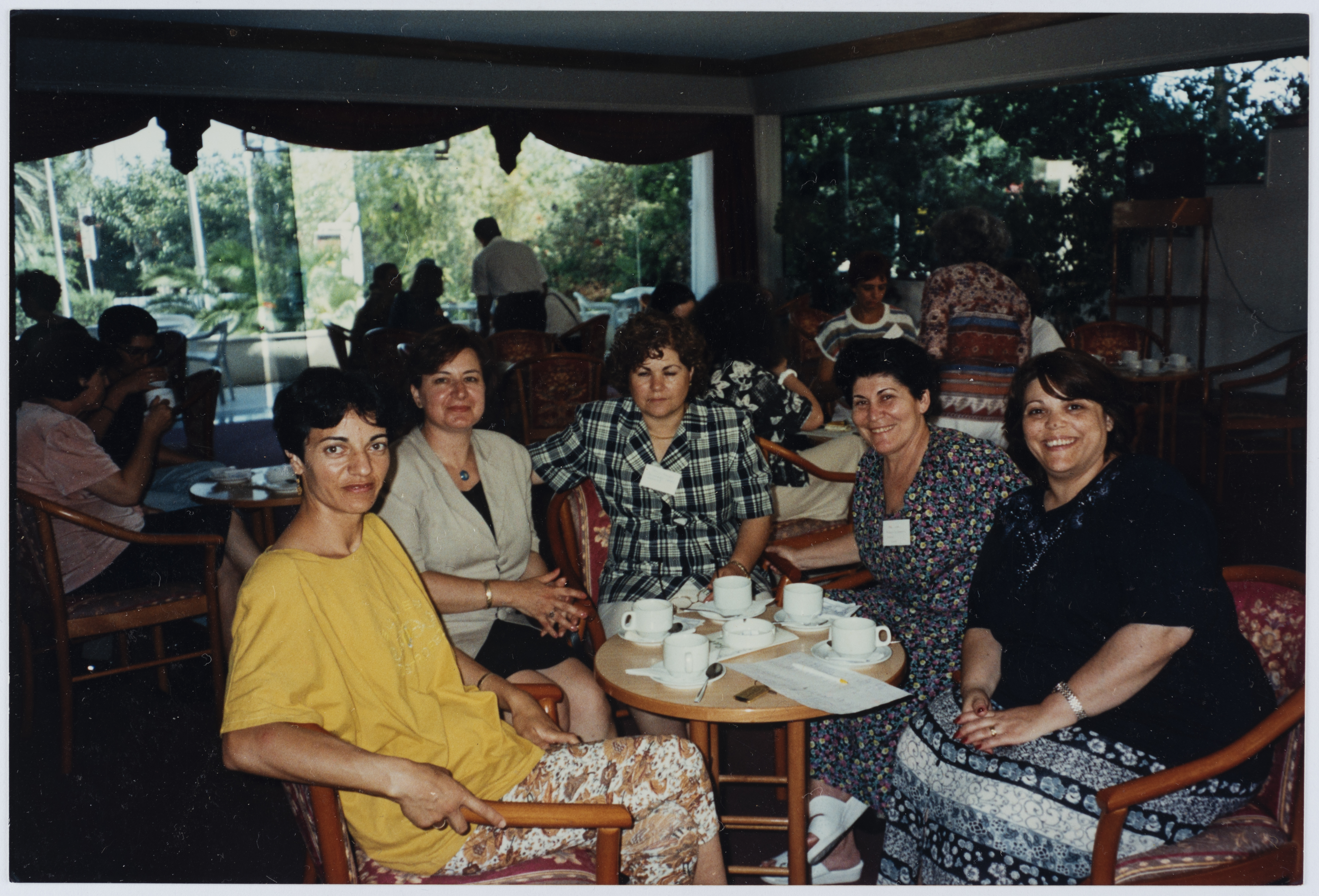 صورة ملونة، تظهر فيها ننيتا بورو- عازانتين سكرتيرة العامة لجمعية نساء حوض البحر وحنة زند عشو سكرتاريا حركة النساء الديمقراطيات وحليمة اغبادية عشو سكرتاريا حركة النساء وفتحيه عوايسة عضو سكرتاريا حركة النساء اثناء مؤتمر نساء حوض البحر المتوسط عام 1996
