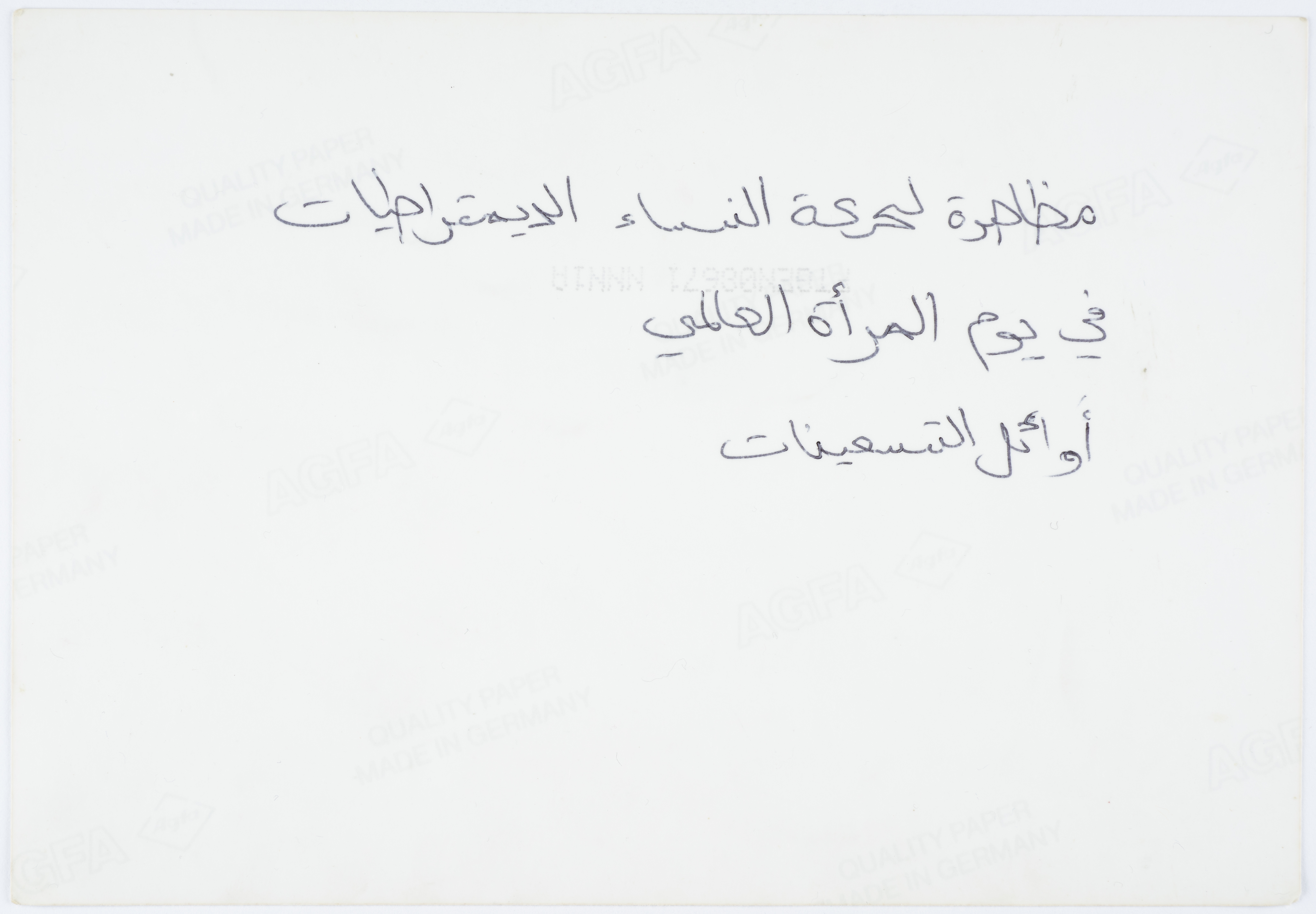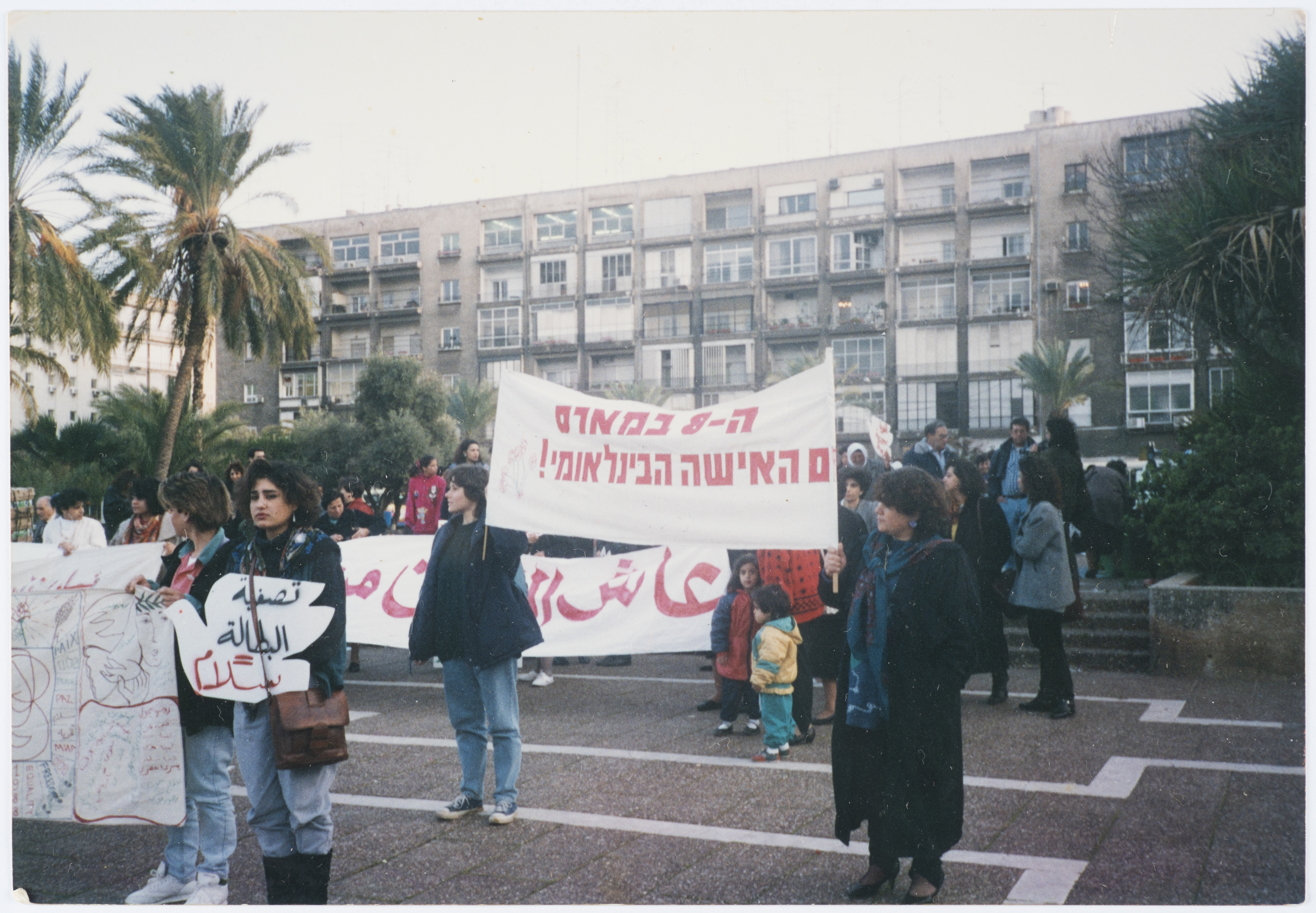 .صورة ملونة، تظهر فيها مجموعة من النساء اثناء مظاهرة لحركة النساء الديمقراطيات في يوم المرأة العالمي في اوائل التسعينات