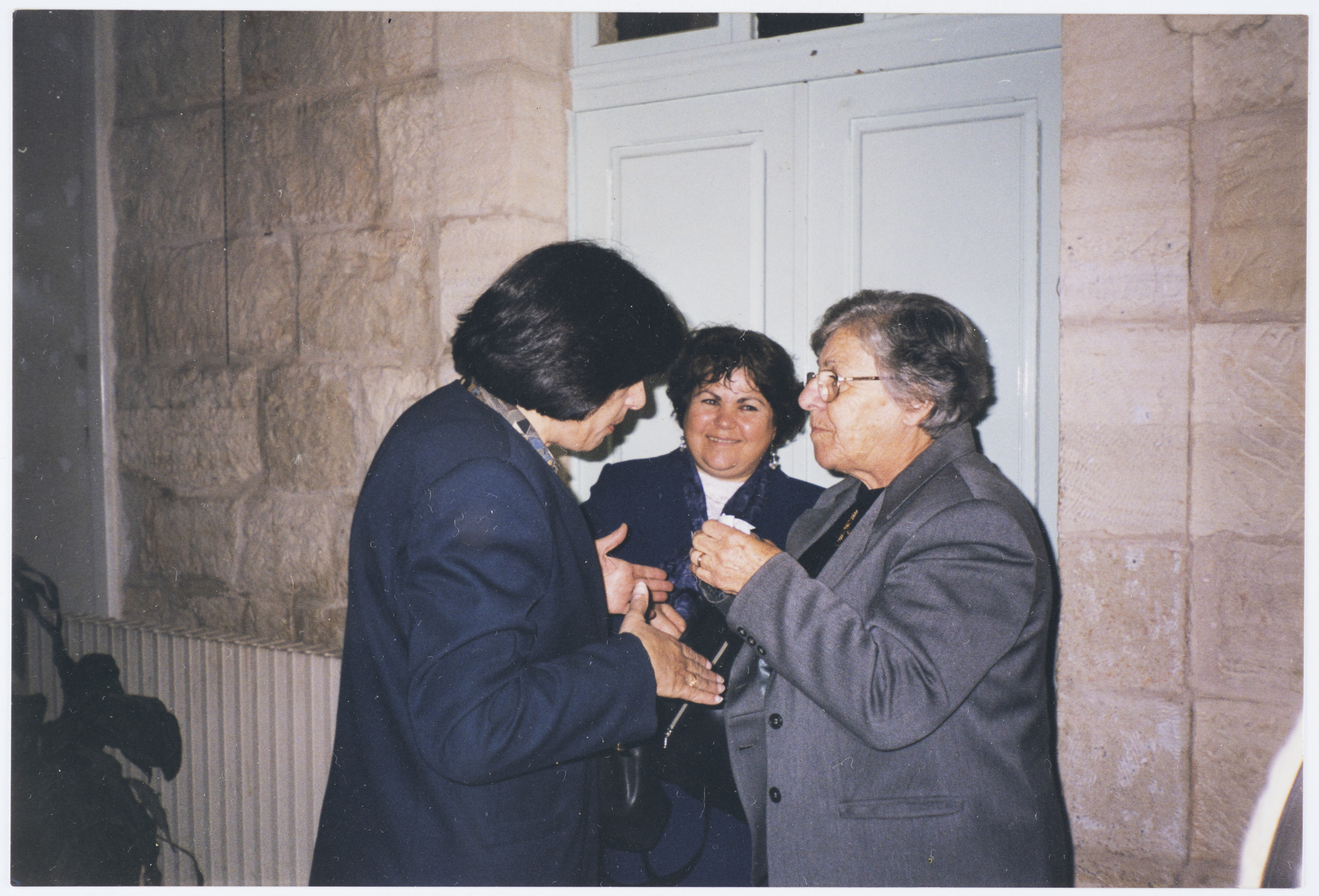 A colour photograph of Zuhair Kaman and Fat'heyeh Awais in a meeting with Palestinian women in Jerusalem on 13/3/1999