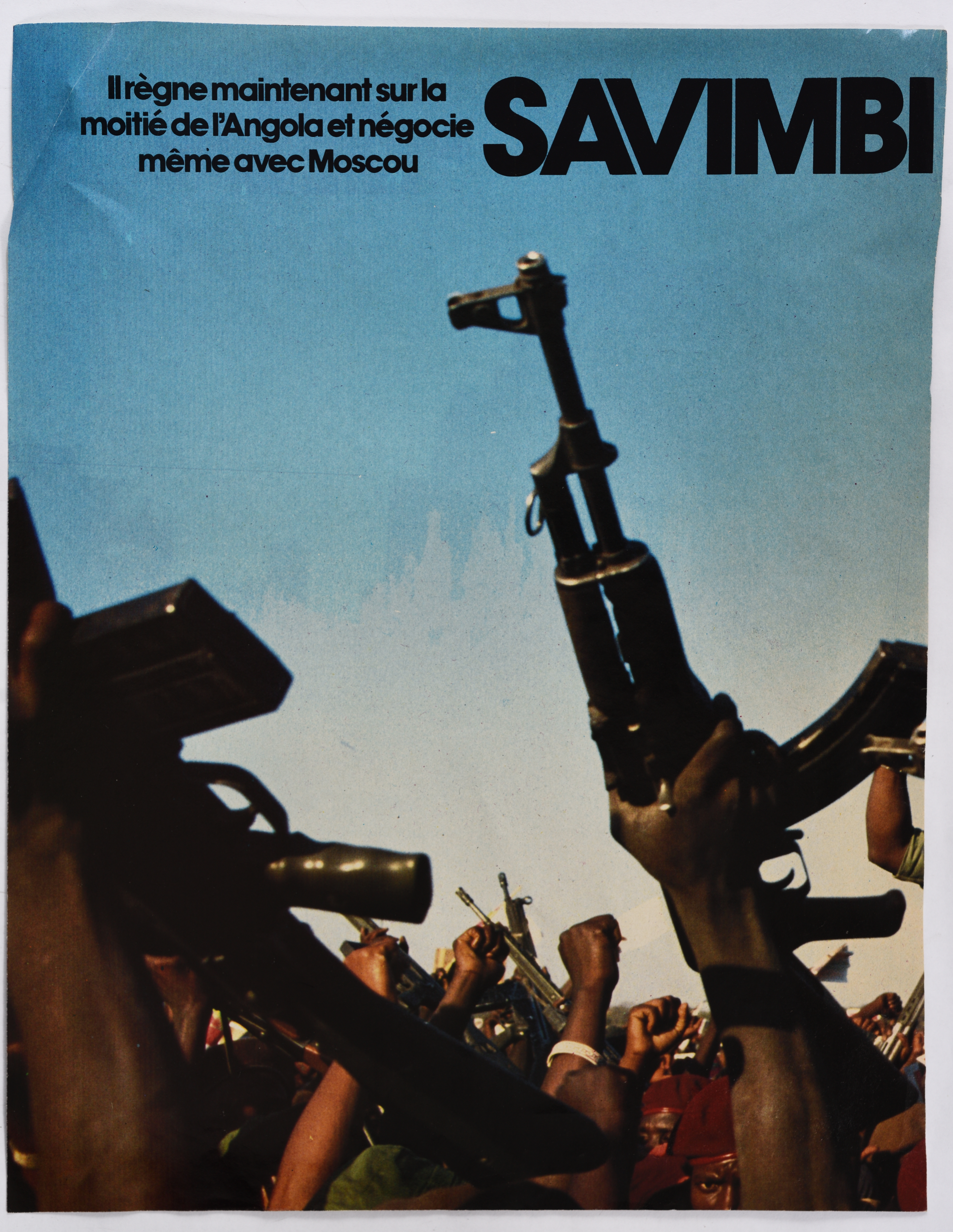 صفحتان من عدد من مجلّة أجنبيّة صادر في ثمانينيّات القرن العشرين، تتضمّن وصفا لجوناس سافيمبي، مؤسس وزعيم حركة يونيتا الأنغولية المعارضة، بكونه يحكم نصف أنغولا ويتفاوض حتى مع موسكو وصورة لمسلّحين.