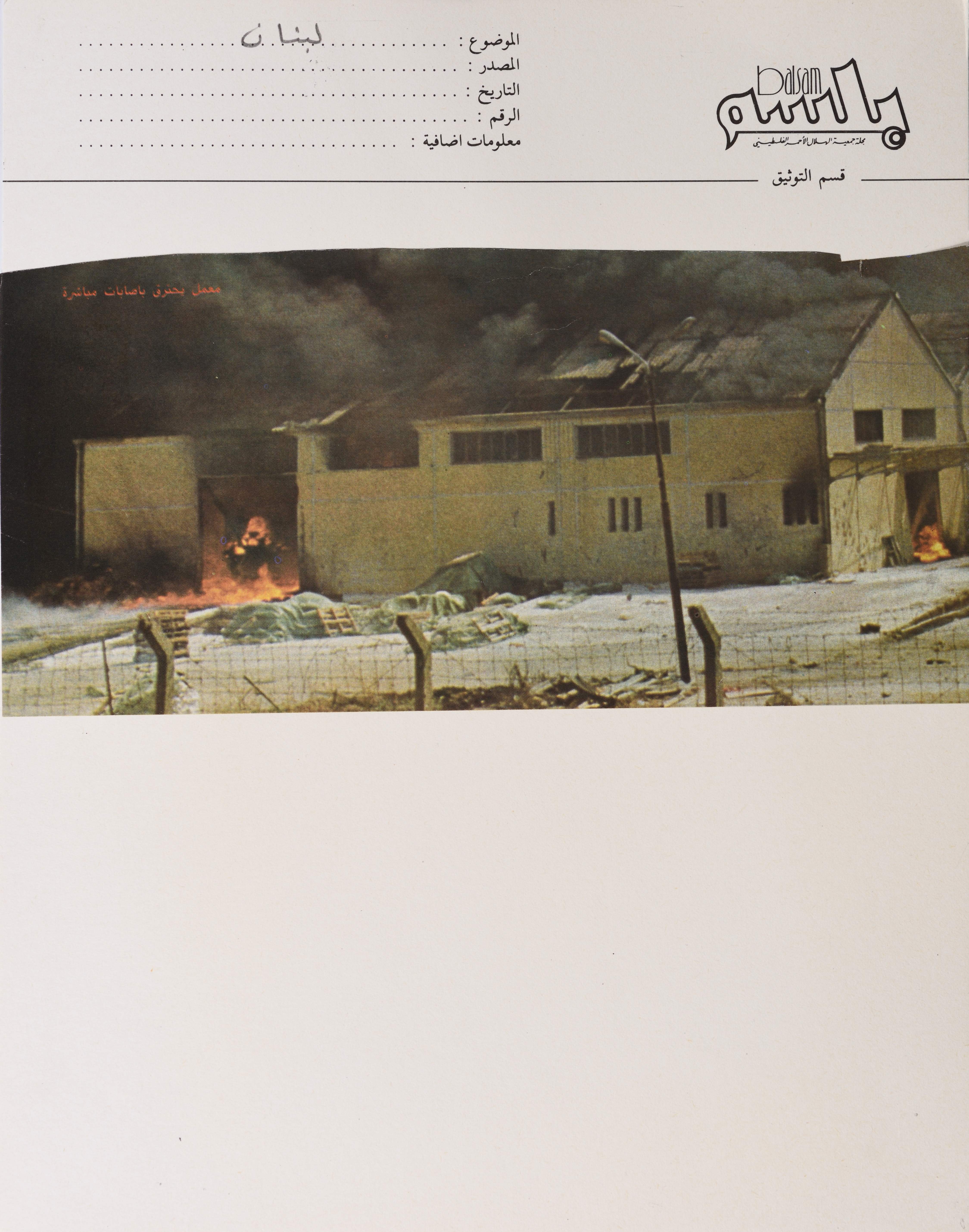 Taken in the 1980s, this photograph is pasted on the card of Balsam Magazine, affiliated with the Palestine Red Crescent Society (PRCS), and shows a workshop that was bombarded in Lebanon, in the course of the 1982 Lebanon War.