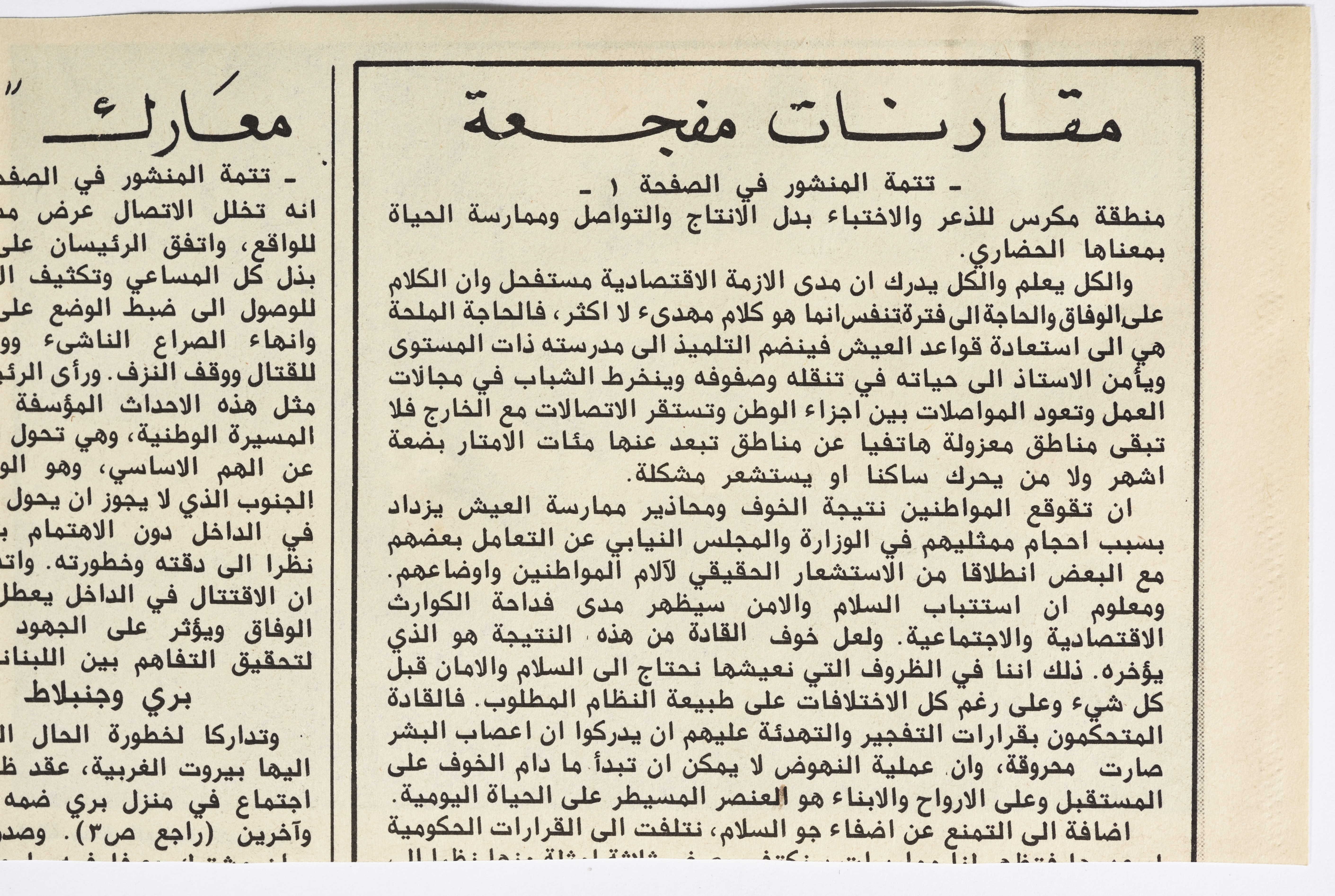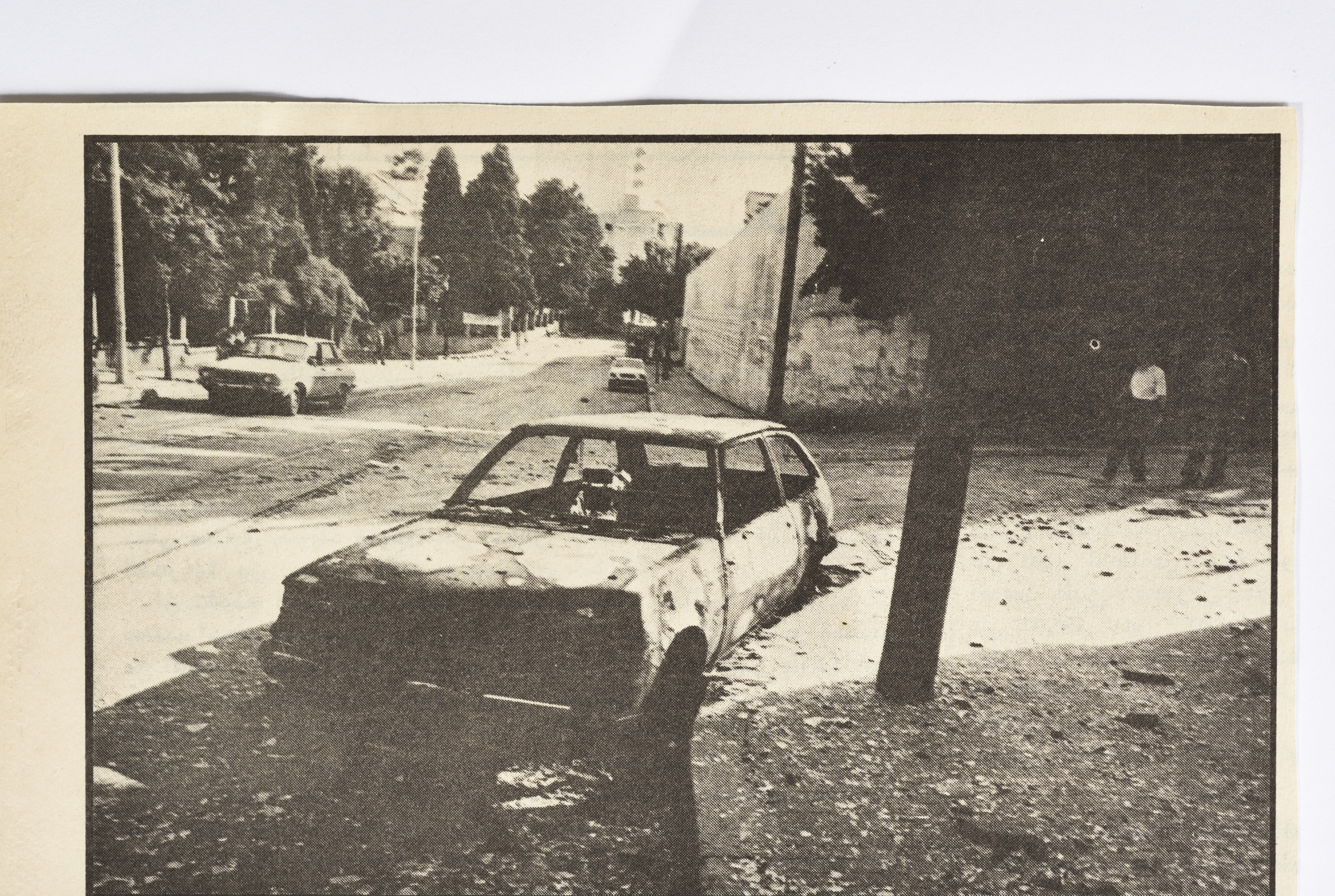 Issued during the period from 1982 to 1989, this document shows a clipping from an issue of a newspaper, containing a photograph of the trail of the destruction left by the bombing and clashes in a neighbourhood in a Lebanese region, in the course of the 1982 Lebanon War.