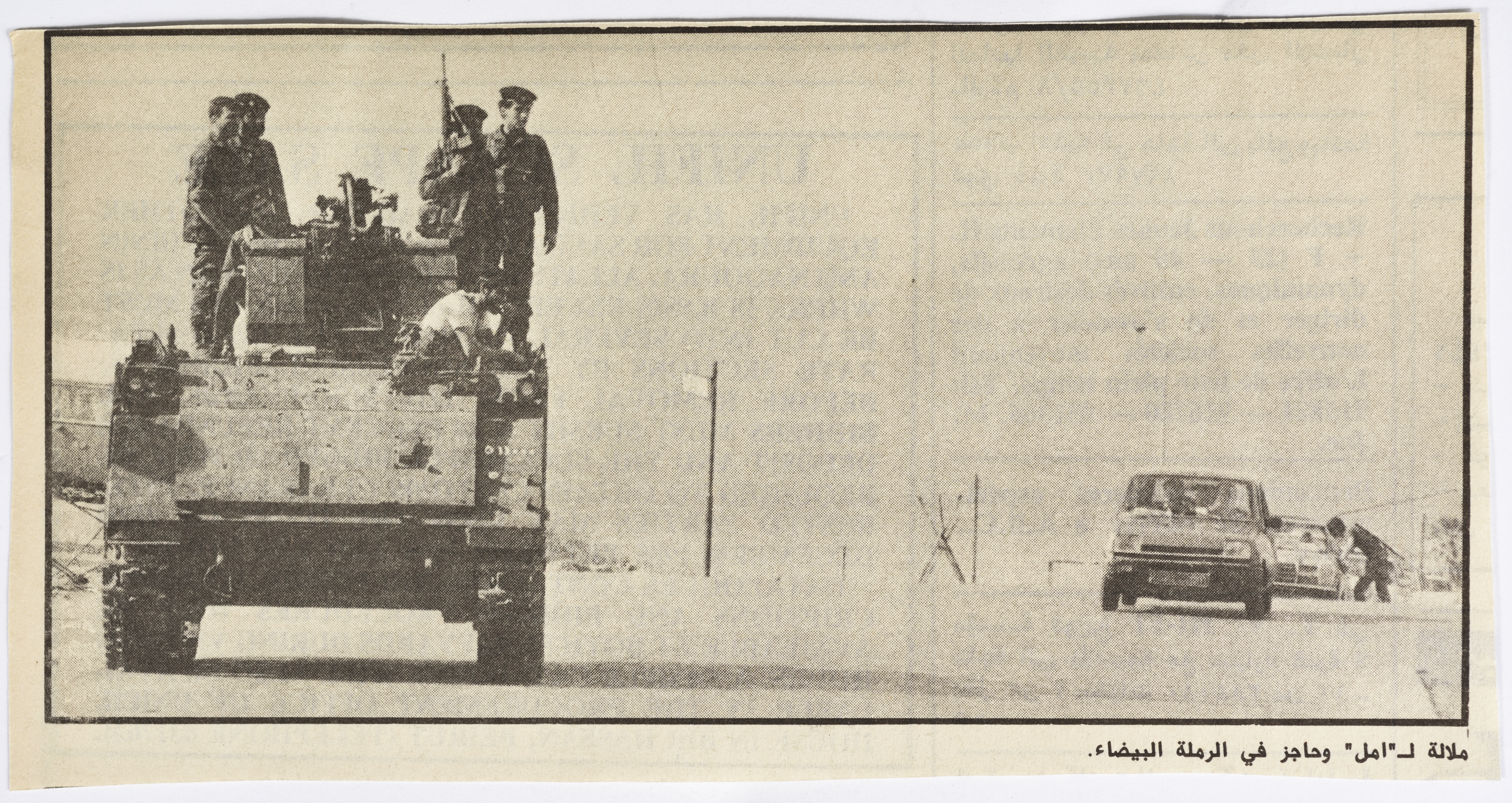 A Lebanese newspaper clipping featuring photographs of the shelling, destruction, and armed clashes during the Lebanese Civil War 1982-1989.