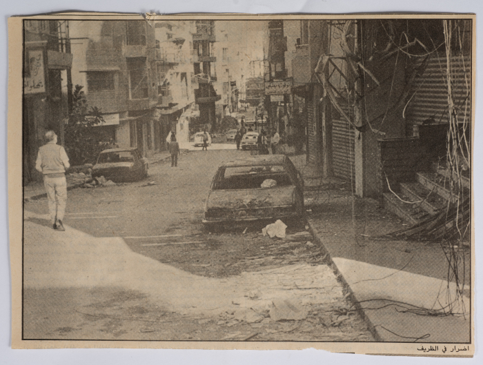 Issued during the period from 1982 to 1989, this document shows a clipping from an issue of a newspaper, containing a photograph titled "Damage to az-Zarif" of the trail of destruction left by the bombing and clashes in az-Zarif neighbourhood in Beirut, in the course of the 1982 Lebanon War.