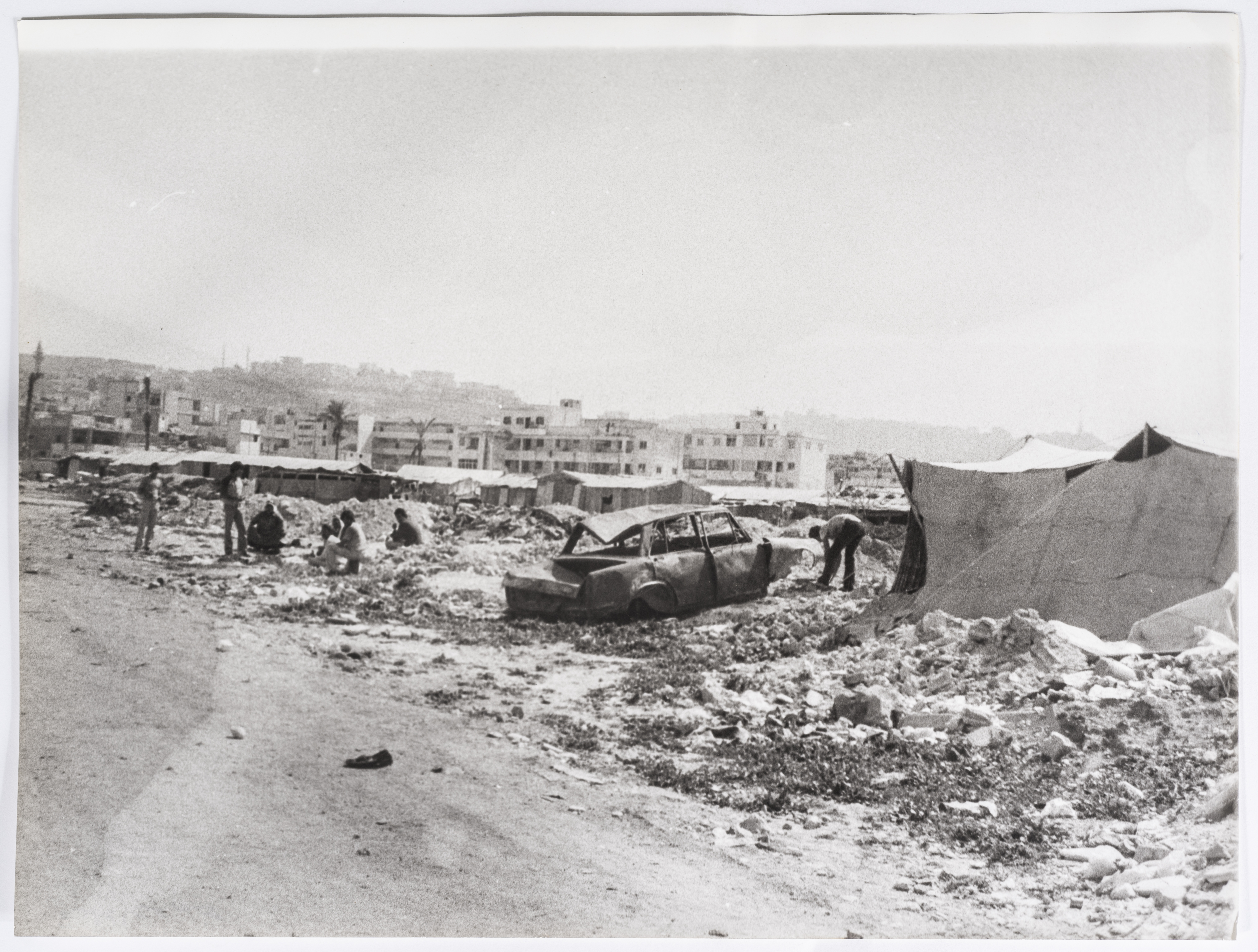 صورة لفلسطينيين لاجئين في مخيم عين الحلوة للاجئين الفلسطينيين، بالقرب من مدينة صيدا بلبنان، خلال حرب لبنان عام 1982. والتُقطت الصورة في الفترة ما بين عاميّ 1982 و1985.