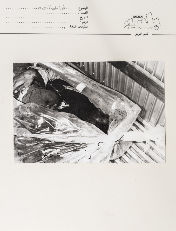Taken in 1983, this photograph is pasted on the card of Balsam Magazine, affiliated with the Palestine Red Crescent Society (PRCS), and shows a victim’s body in the city of Tripoli in Lebanon, in the course of the Lebanese Civil War.