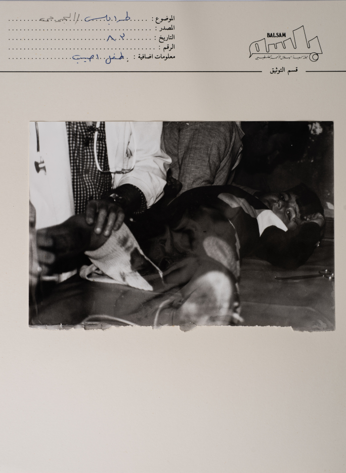 صورة ملصقة على بطاقة مجلة بلسم، التابعة لجمعية الهلال الأحمر الفلسطيني، يظهر بها طفل جريح في مدينة طرابلس بلبنان، خلال الحرب الأهلية اللبنانية. والتُقطَت الصورة في عام 1983.