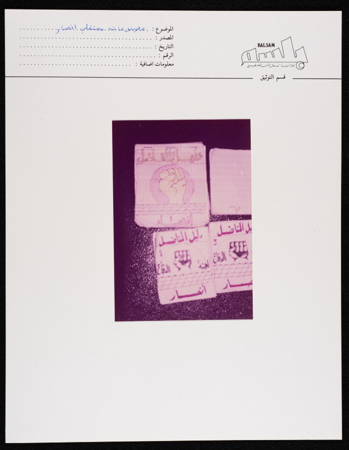 Taken during the period from 1982 to 1985, this photograph is pasted on the card of Balsam Magazine, affiliated with the Palestine Red Crescent Society (PRCS), and shows a handicraft product produced by the prisoners of the Ansar Detention Center in South Lebanon.
