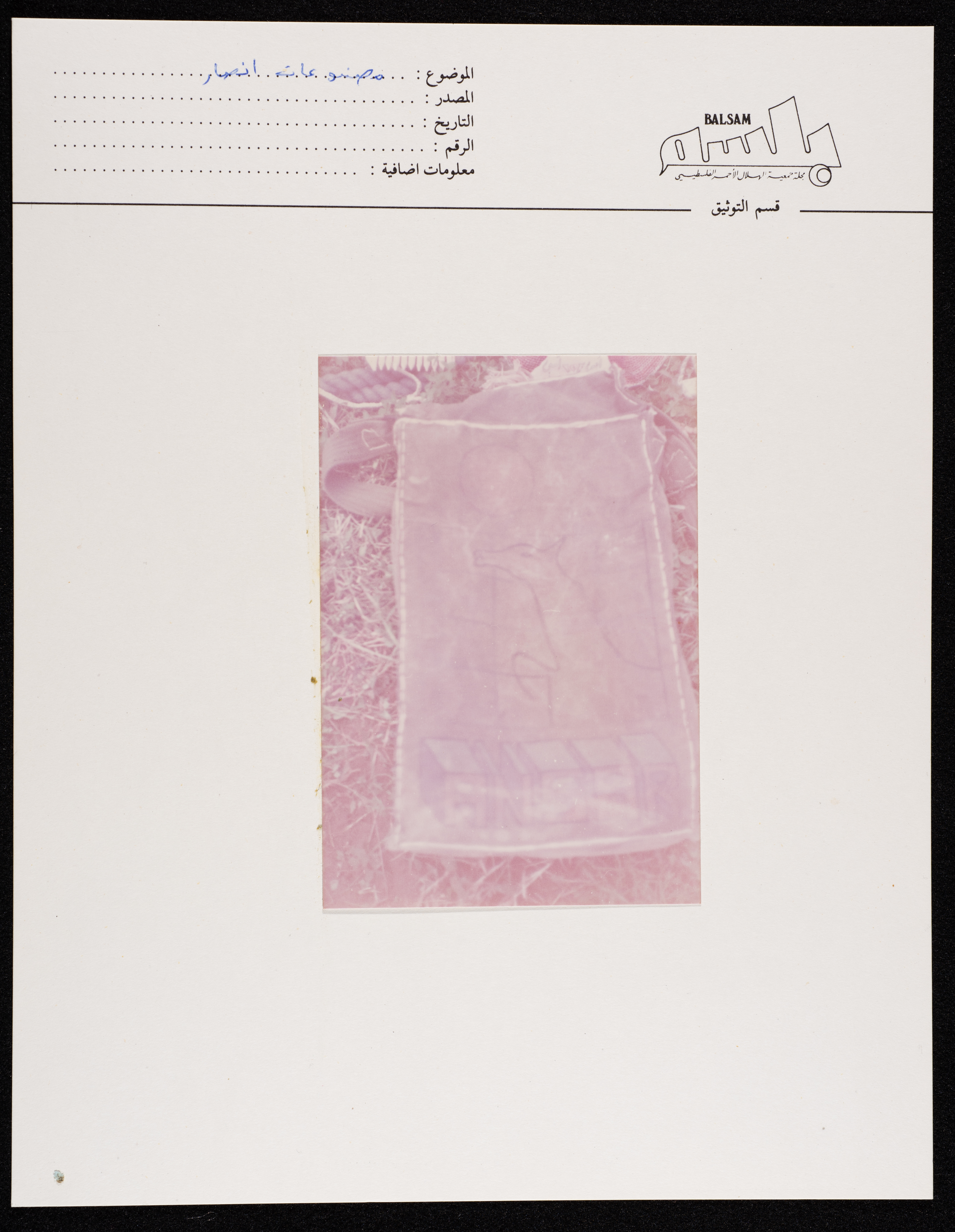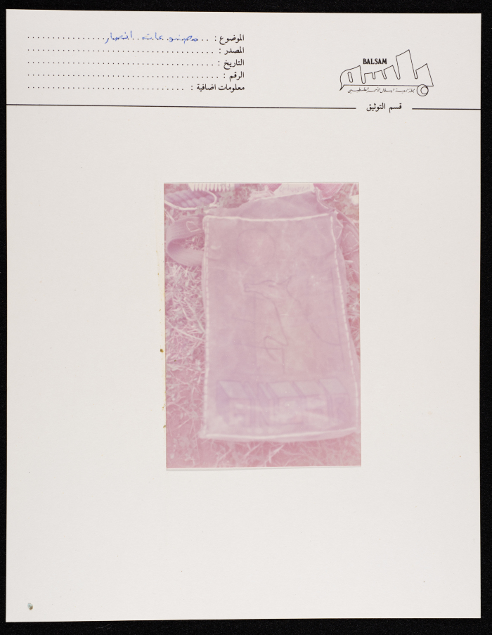 صورة ملصقة على بطاقة مجلة بلسم، التابعة لجمعية الهلال الأحمر الفلسطيني، تظهر بها إحدى مصنوعات أسرى مُعتَقَل أنصار في جنوب لبنان. والتُقطت الصورة ما بين عامي 1982 و1985.