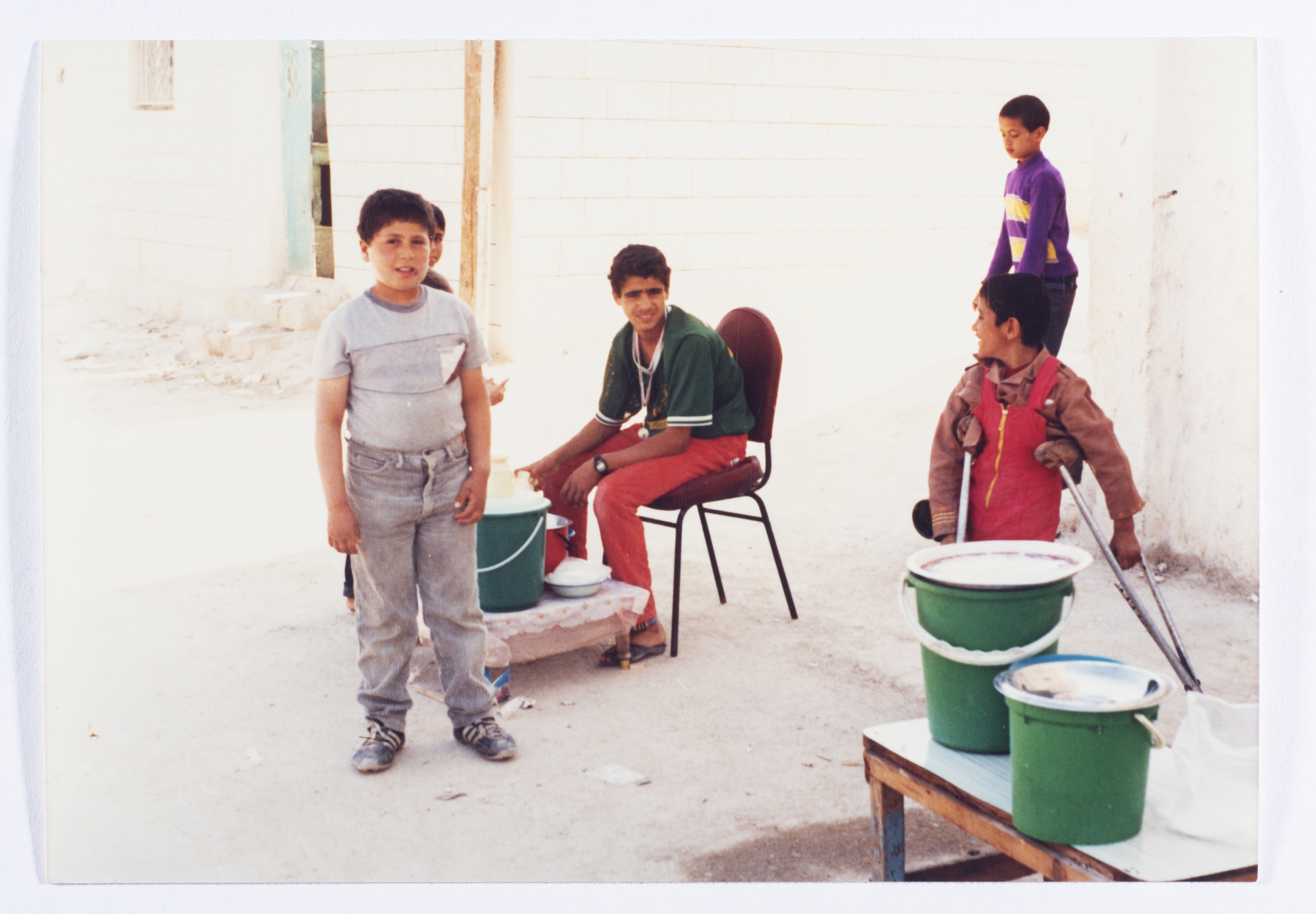 صورة لأطفال من الباعة المتجوّلين في مخيم عمّان الجديد للاجئين الفلسطينيين، والذي يُعرَف محلياً باسم مخيم الوحدات، في الأردن. والتُقطت الصورة في أيّار 1986.