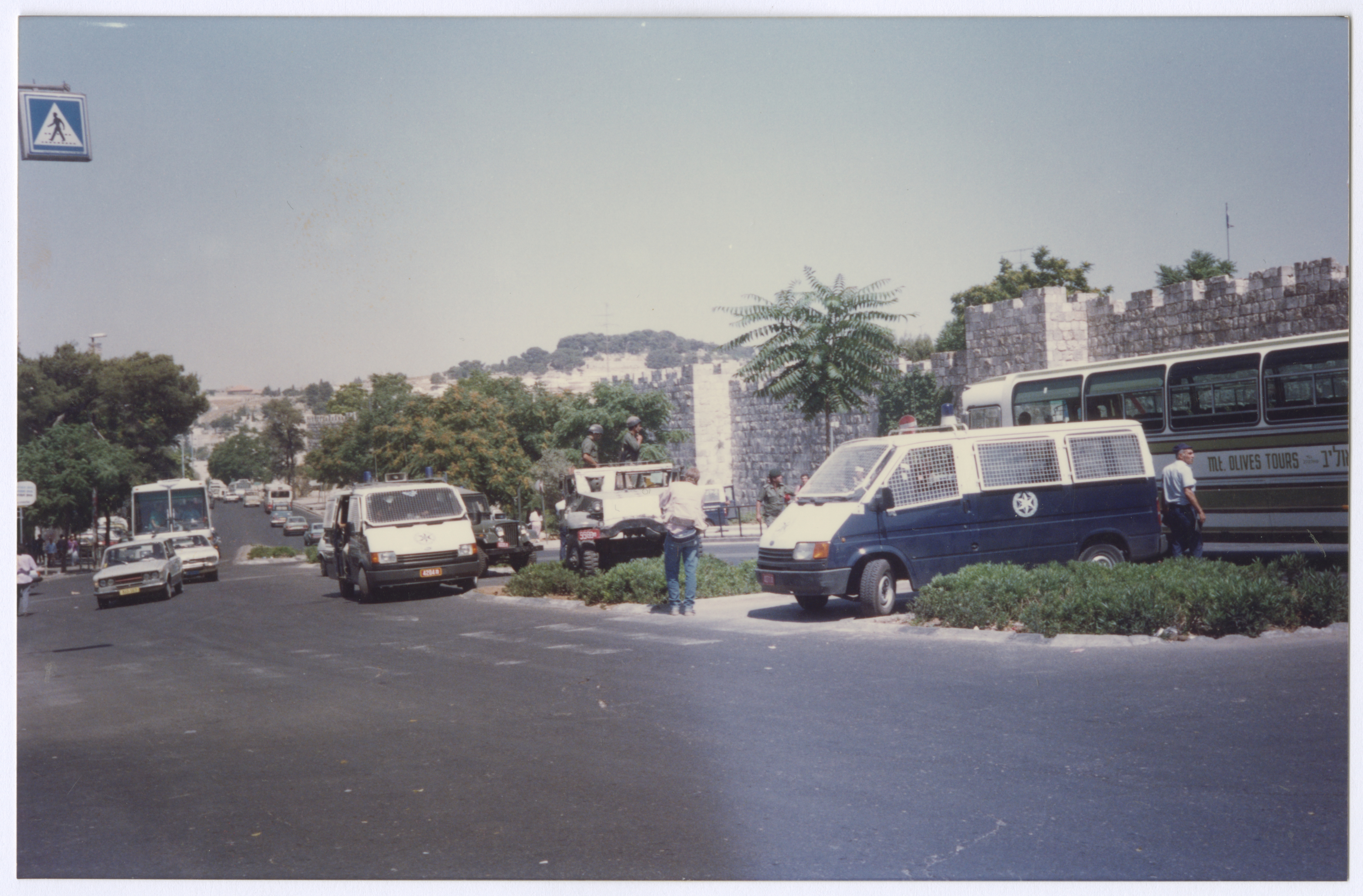 Taken on 6 June 1989, this photograph shows several Israeli Occupation Forces (IOF) police cars on the day of shaheed Omar al-Qasim's funeral near the old city's wall in Jerusalem.