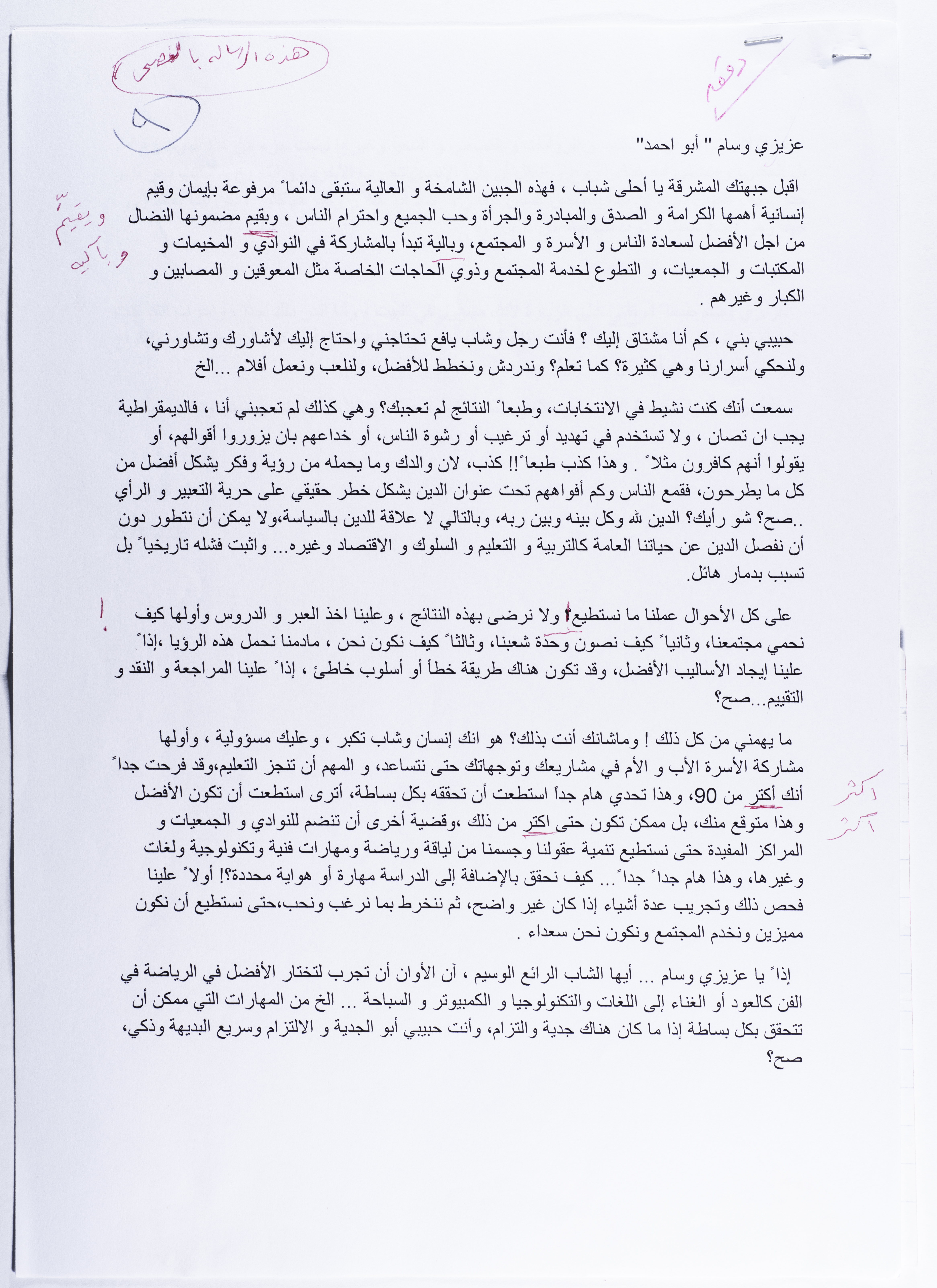 مادة مطبوعة باللغة العربية، وهي رسالة من أحمد المسلماني إلى ابنه وسام، كتبت في تاريخ 29 كانون الثاني عام 2006، حول مشاركة ابنه في انتخابات التشريعي عام 2006، وعدم رضاه عن نتائج الانتخابات، كما يحثه على ضرورة اختيار نوع من الرياضة او الفن، ويبارك له نتيجة المدرسة.