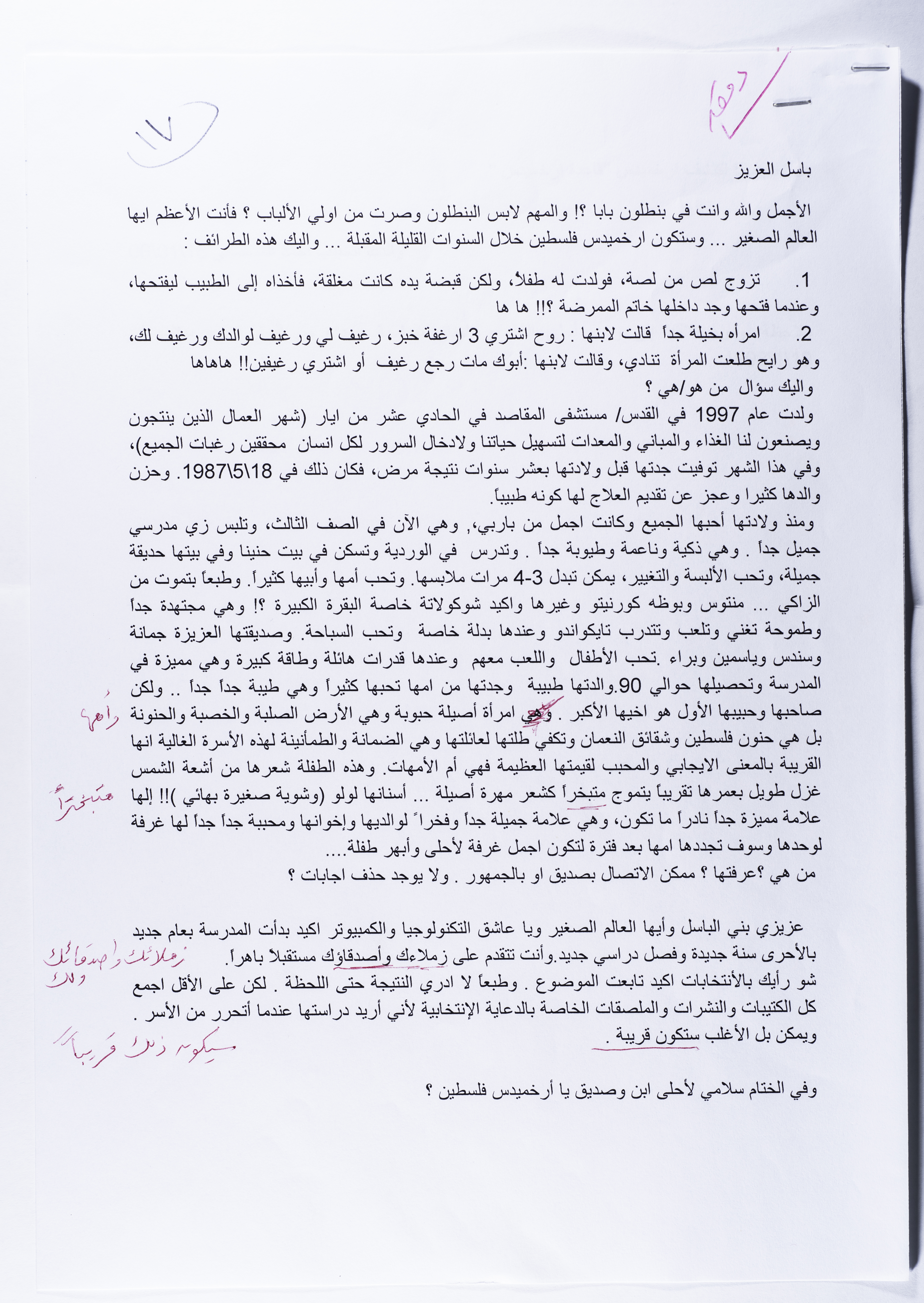 مادة مطبوعة باللغة العربية، وهي رسالة من أحمد المسلماني إلى ابنه باسل، كتبت في تاريخ 16 كانون الثاني عام 2006، تتضمن الرسالة بعض النكت والقصص، ويرسل له سلام ولأخيه وسام بسبب عودته من السفر ولعيد ميلاده في تاريخ 18 كانون الثاني 1993.