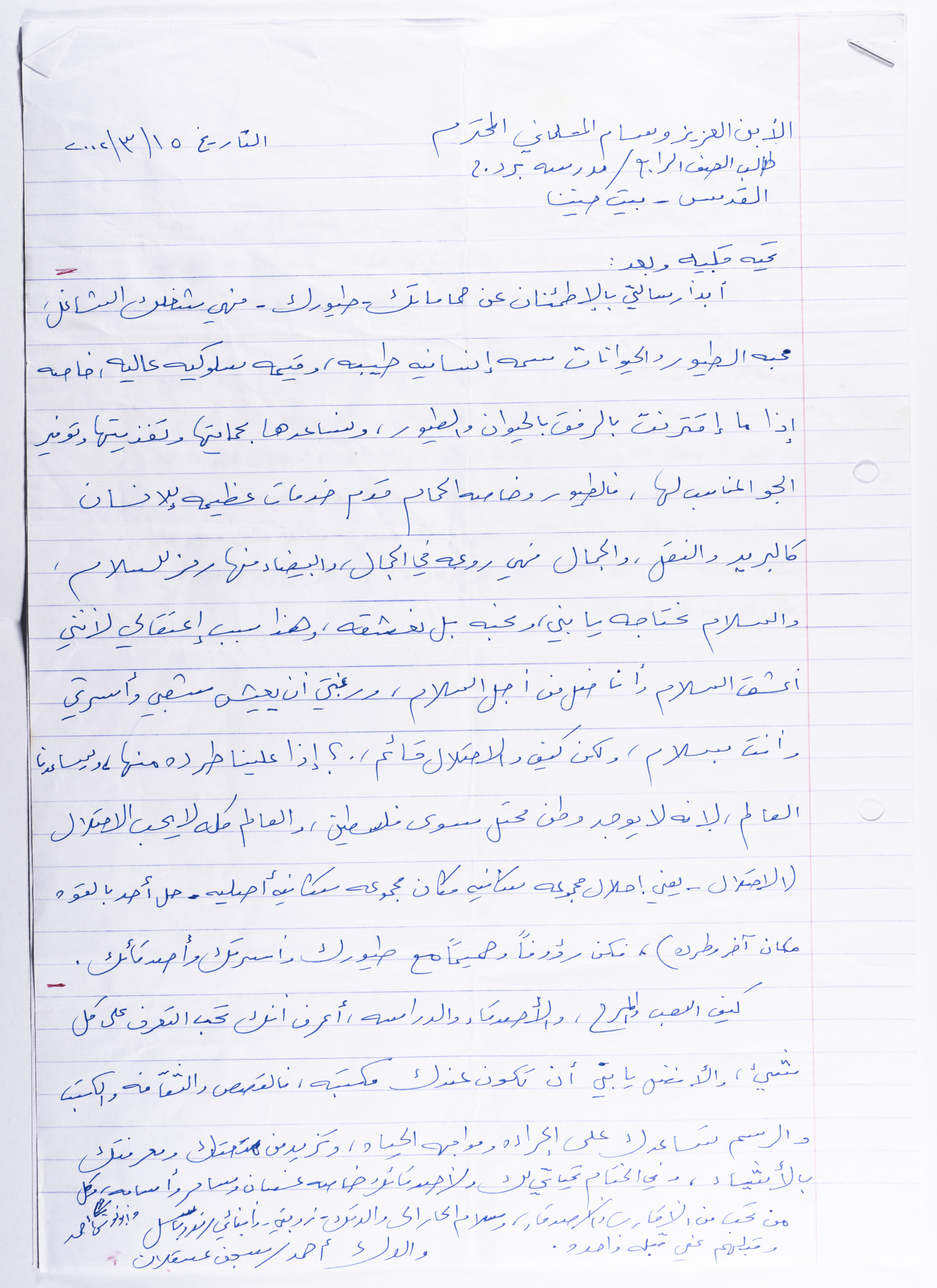 مادة مكتوبة باللغة العربية، وهي رسالة من أحمد المسلماني إلى ابنه وسام، في تاريخ 15 آذار 2002، حول تربية الطيور ومحبة الحيوانات والانسانية والسلام.