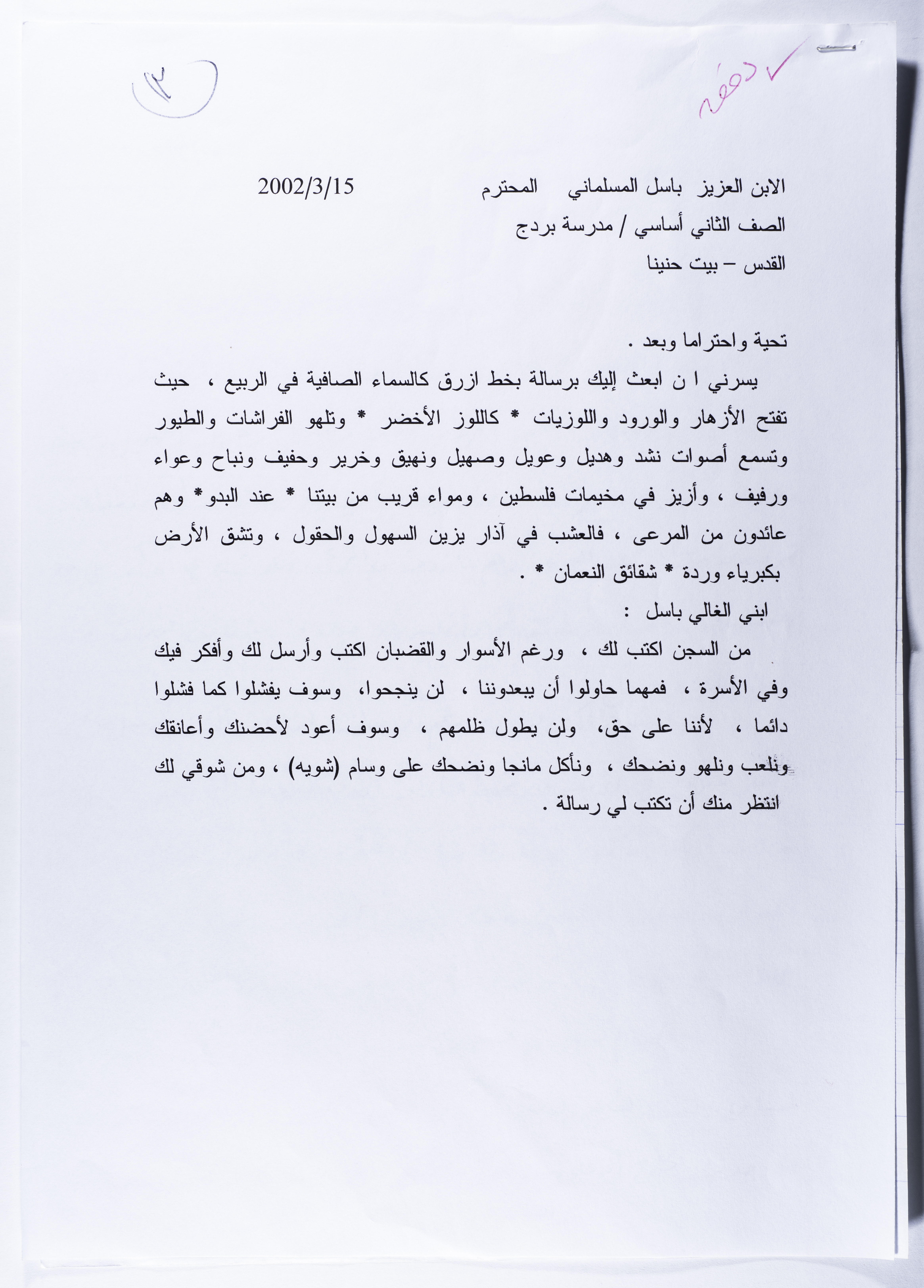 مادة مطبوعة باللغة العربية، وهي رسالة من أحمد المسلماني إلى ابنه باسل، كتبت في تاريخ 15 آذار 2002.