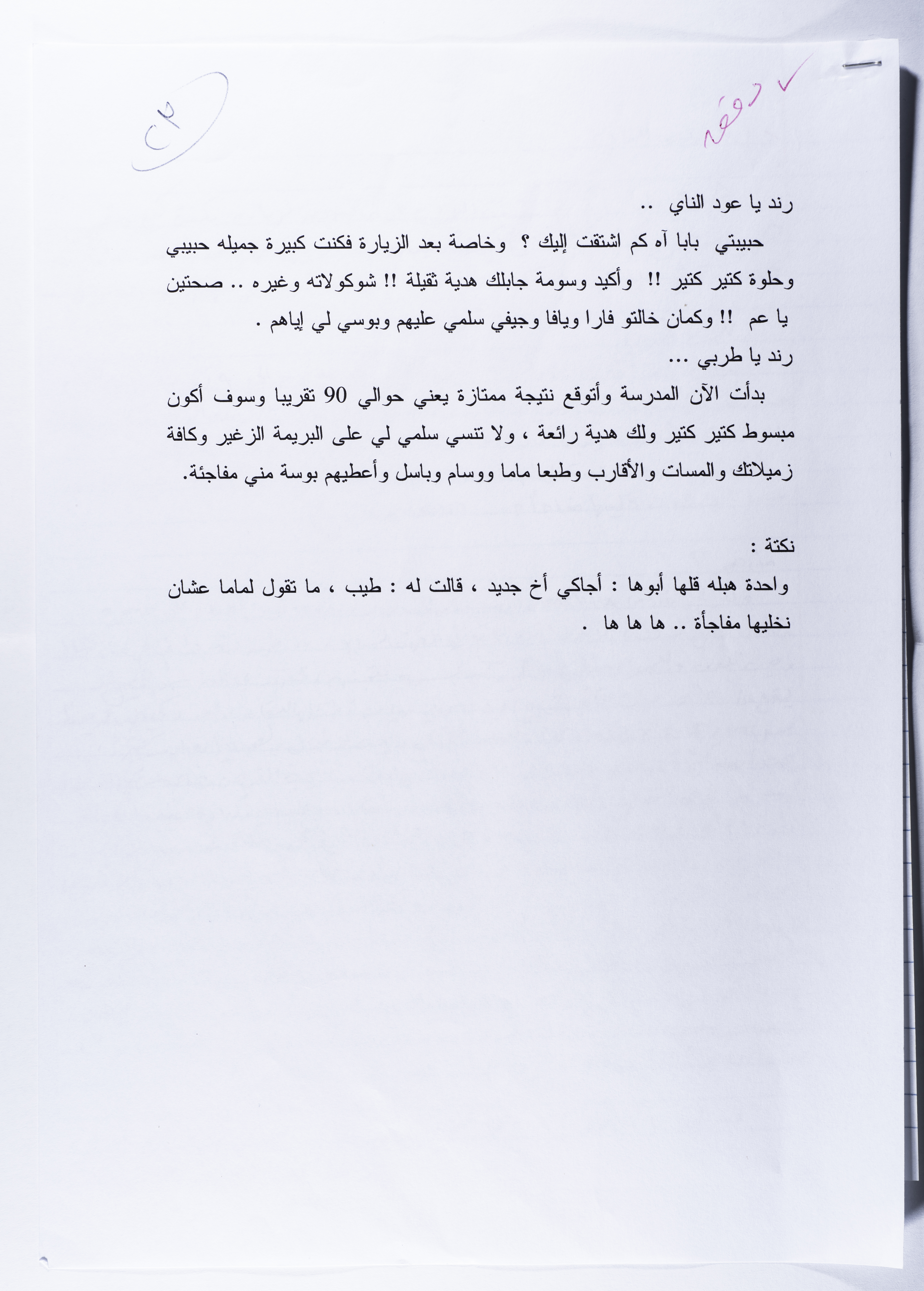 مادة مطبوعة باللغة العربية، وهي رسالة من أحمد المسلماني إلى ابنته رند، يعبر عن اشتياقه ويوصل سلامه.