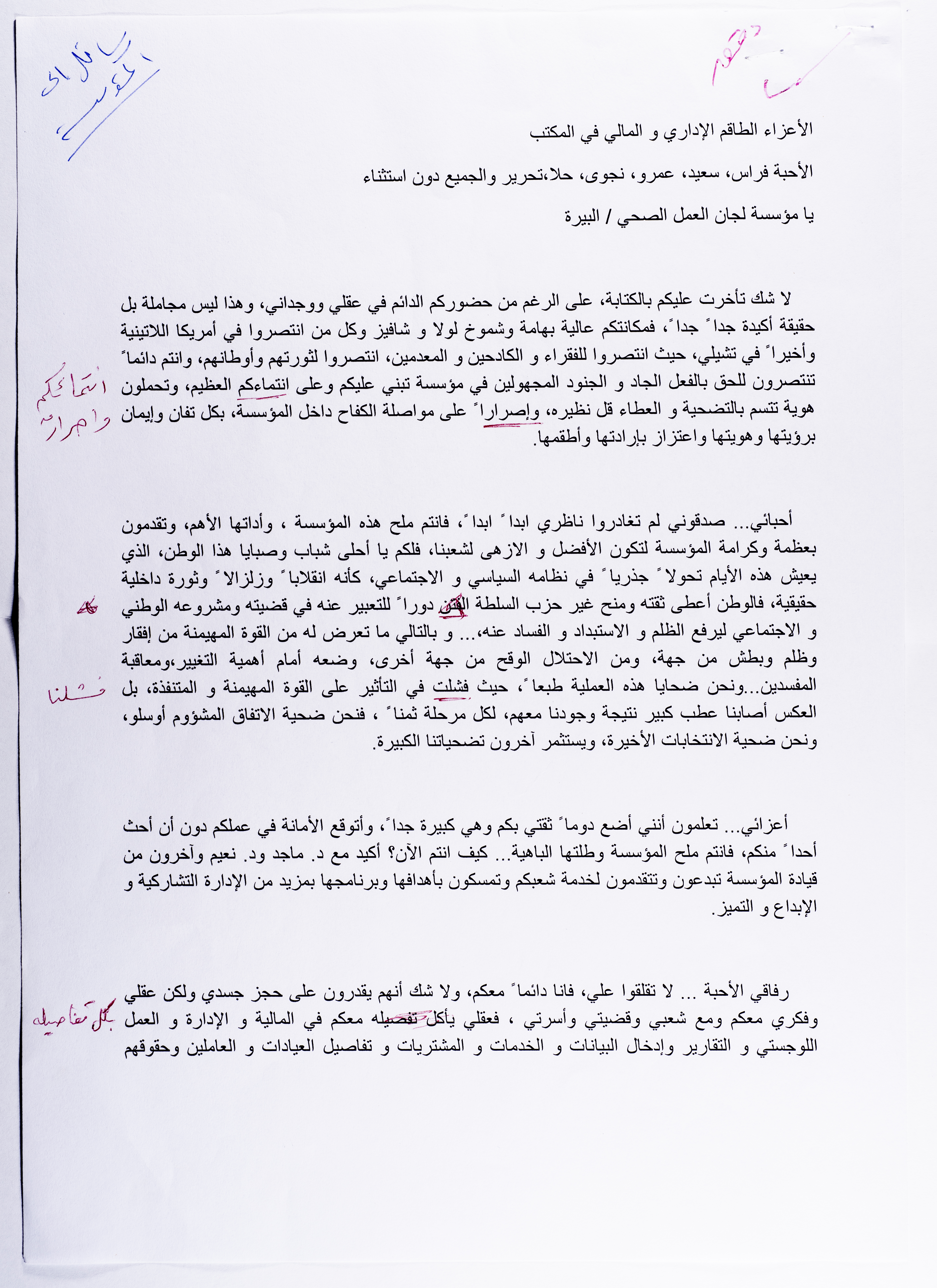 A Letter from Ahmad al-Maslamani to the Administrative and Finance Department at the Health Work Committees