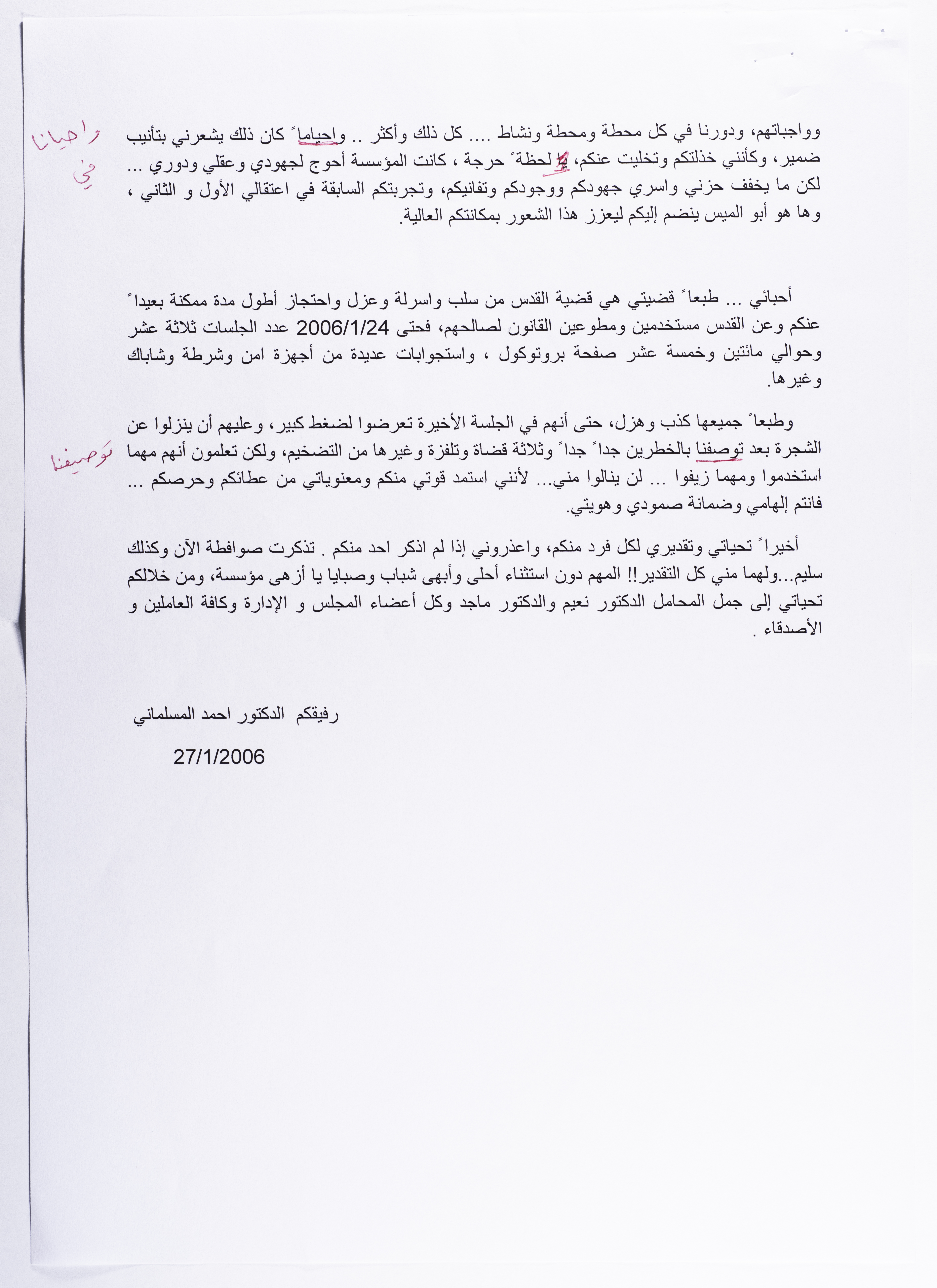 Printed in Arabic on January 27th, 2006, this document features a letter from Ahmad al-Maslamani to the Administrative and Finance Department at the Health Work Committees.