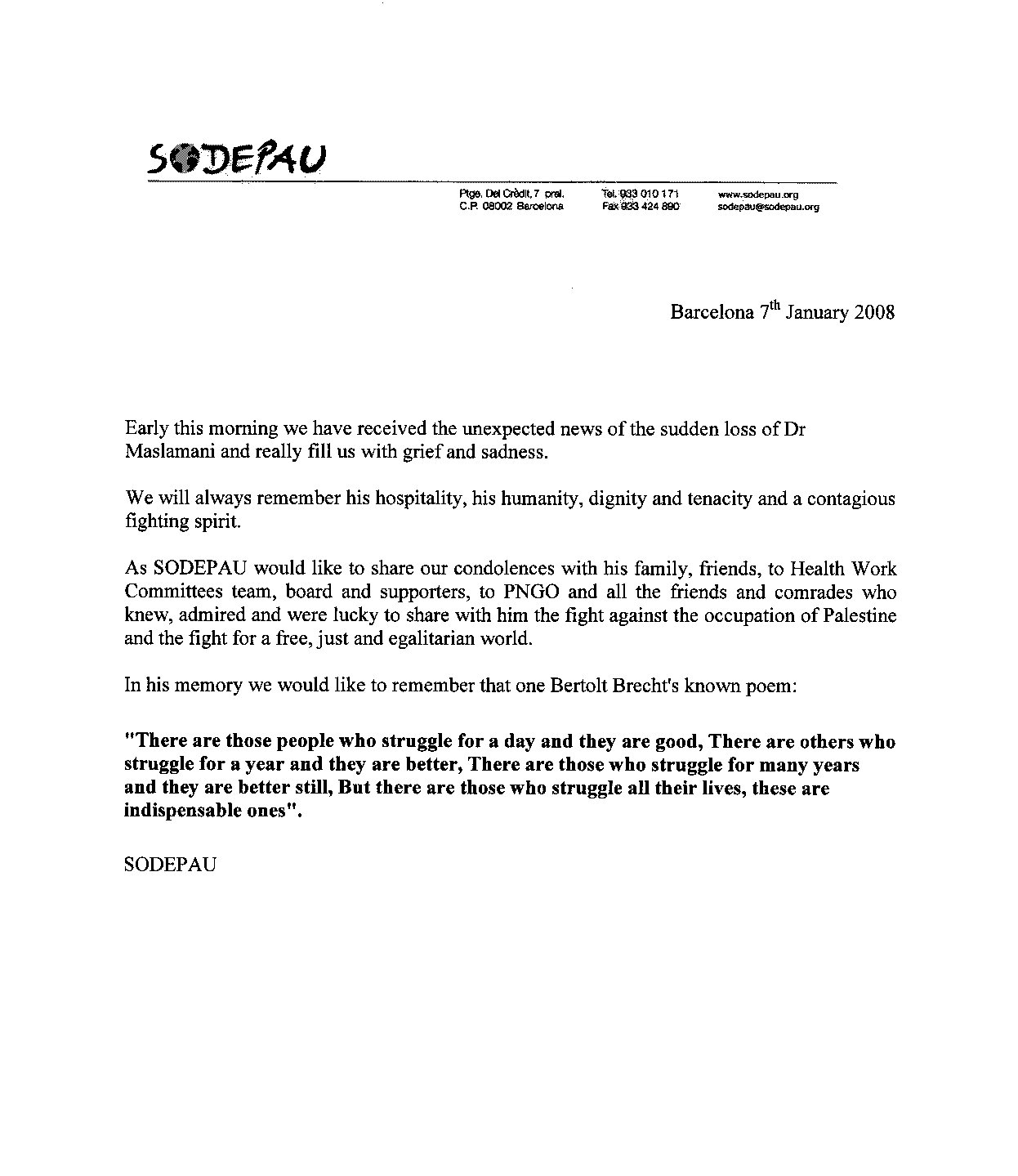 Printed in English by Sodepau Association in Barcelona, this document features a letter of condolences for the passing of Dr Ahmad al-Maslamani, sent to his family and to the Health Work Committees.