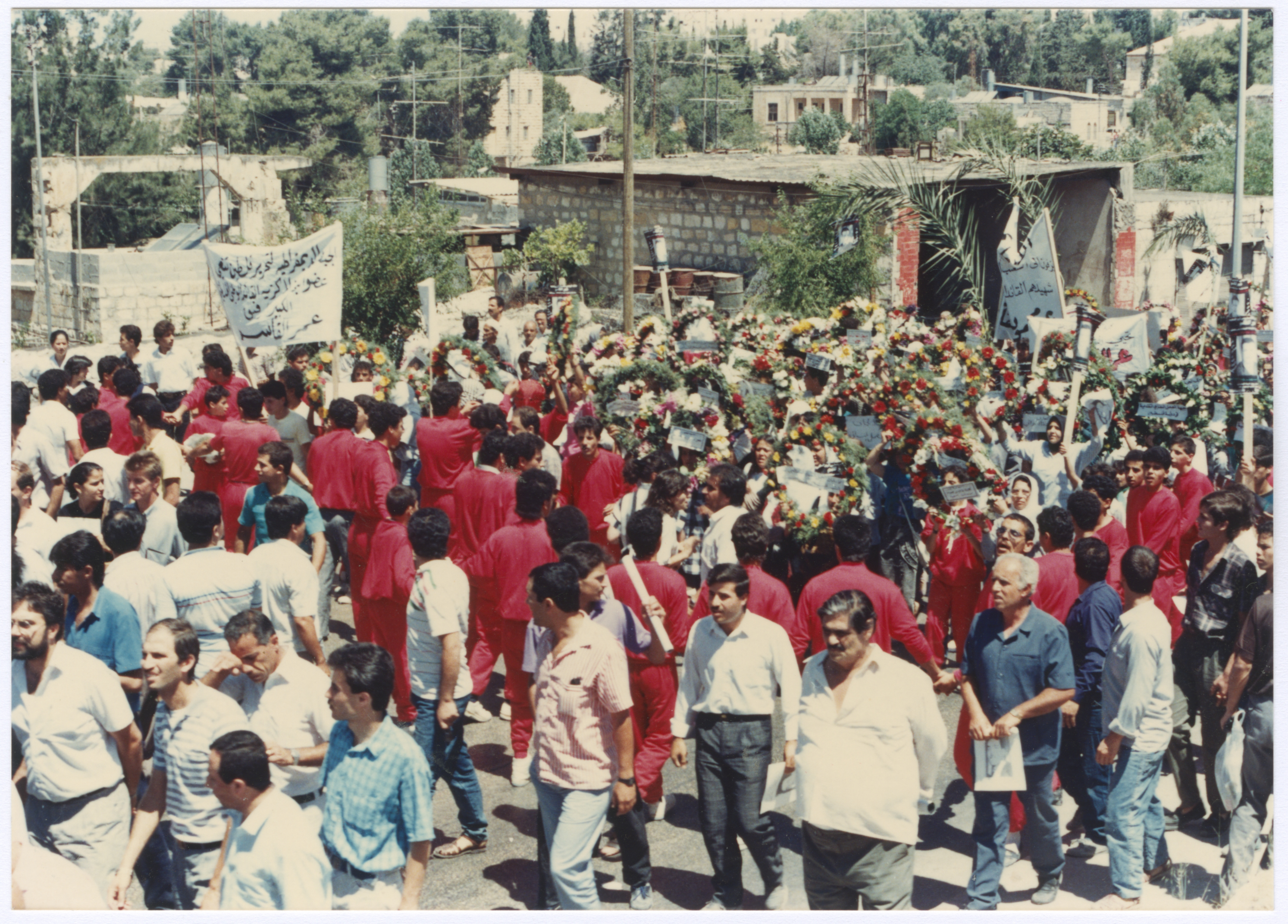 صورة من جنازة الشهيد عمر القاسم، التي جابت مدينة القدس، وقد عُرف من المشيعين الحاج عبد ذياب، وذلك في 6 حزيران 1989.