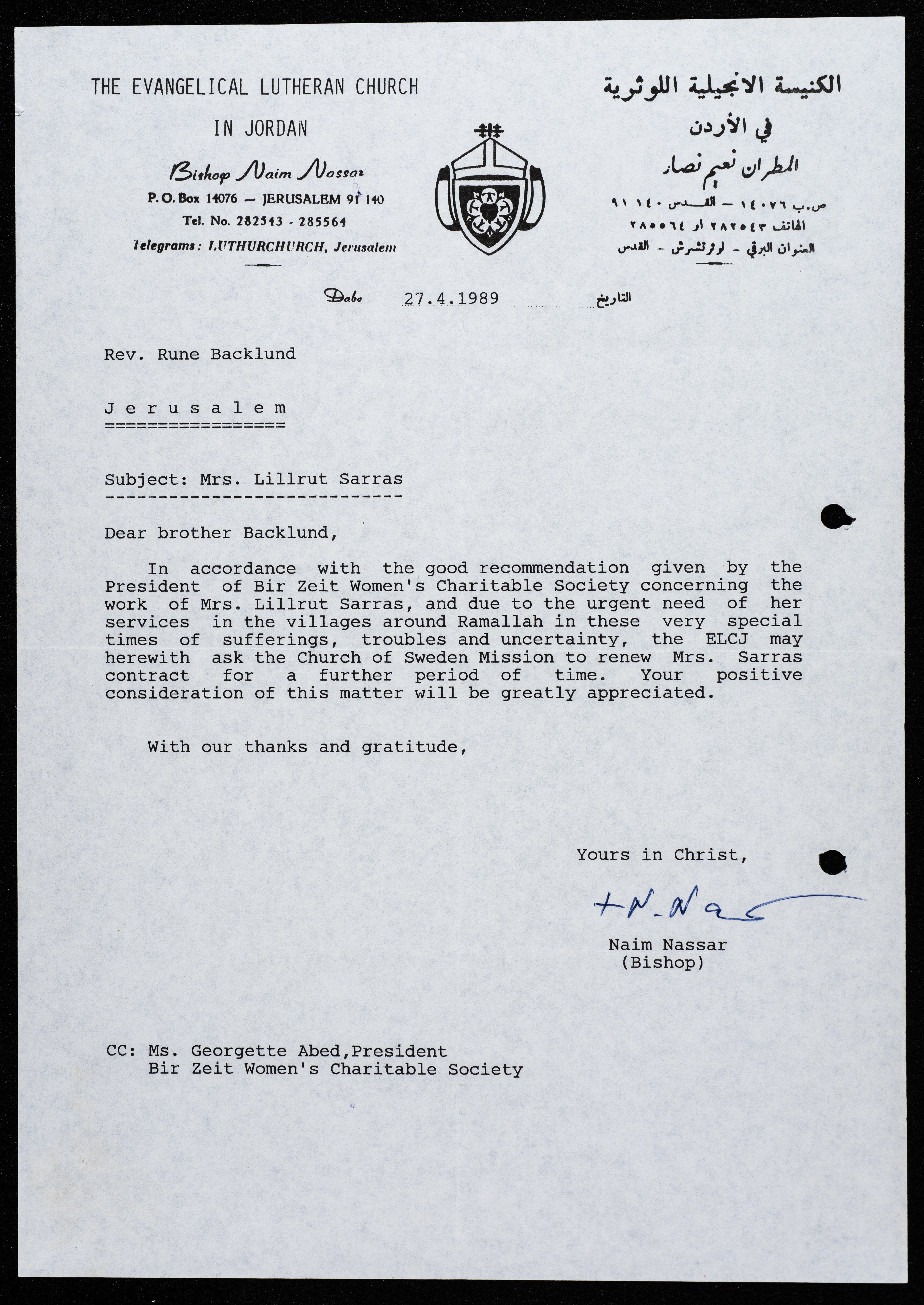 Found in the Birzeit Women Charitable Society Collection, this document shows a letter from Bishop Naʿim Naṣar from the Evangelical Lutheran Church in Jordan to Birzeit Women Charitable Society, 1989.
