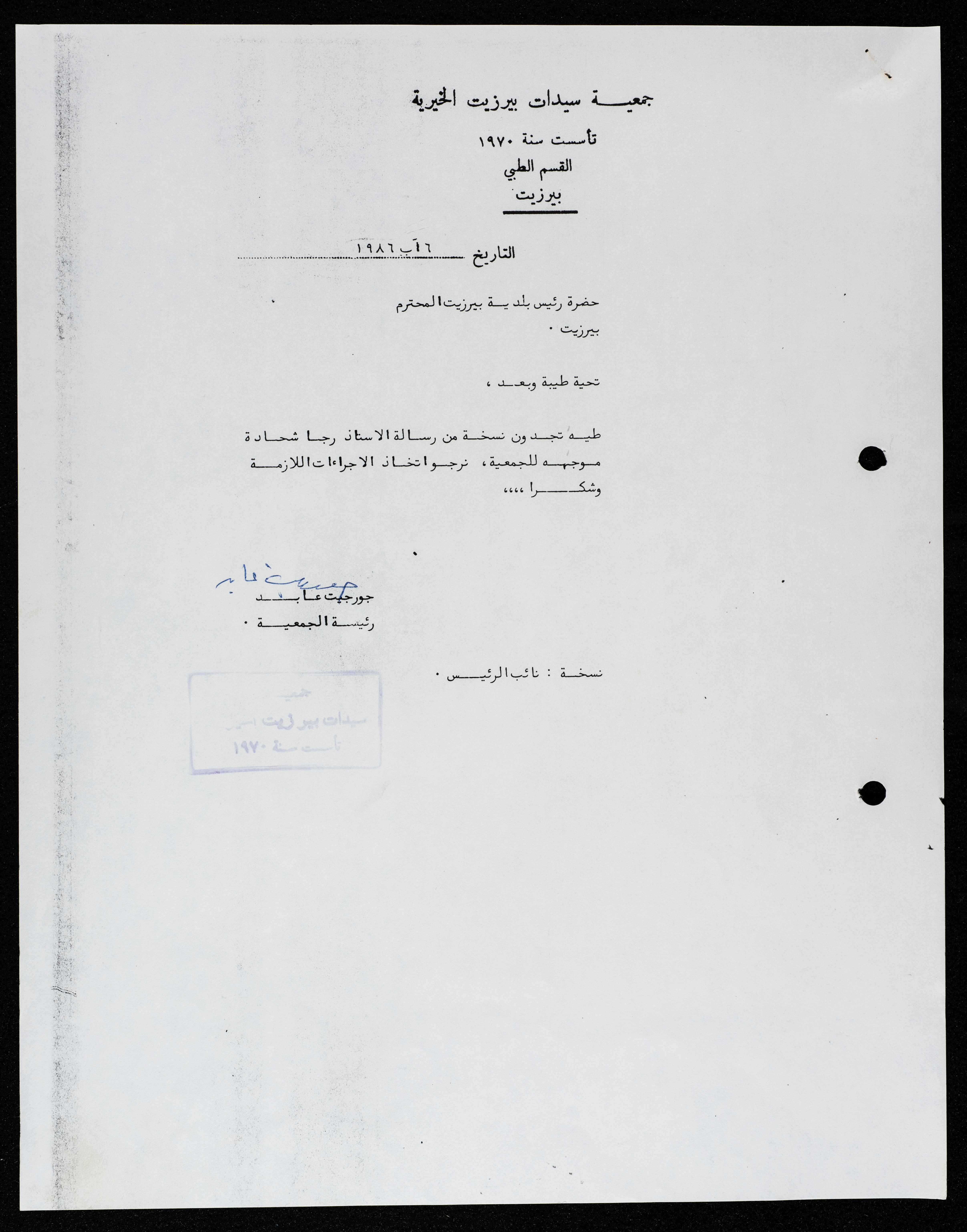 مادة مطبوعة باللغة العربية وهي عبارة عن رسالة صادرة عن القسم الطبي لجمعية سيدات بيرزيت الخيرية عام 1986،وُجِدت في مجموعة جمعية سيدات بيرزيت الخيرية.