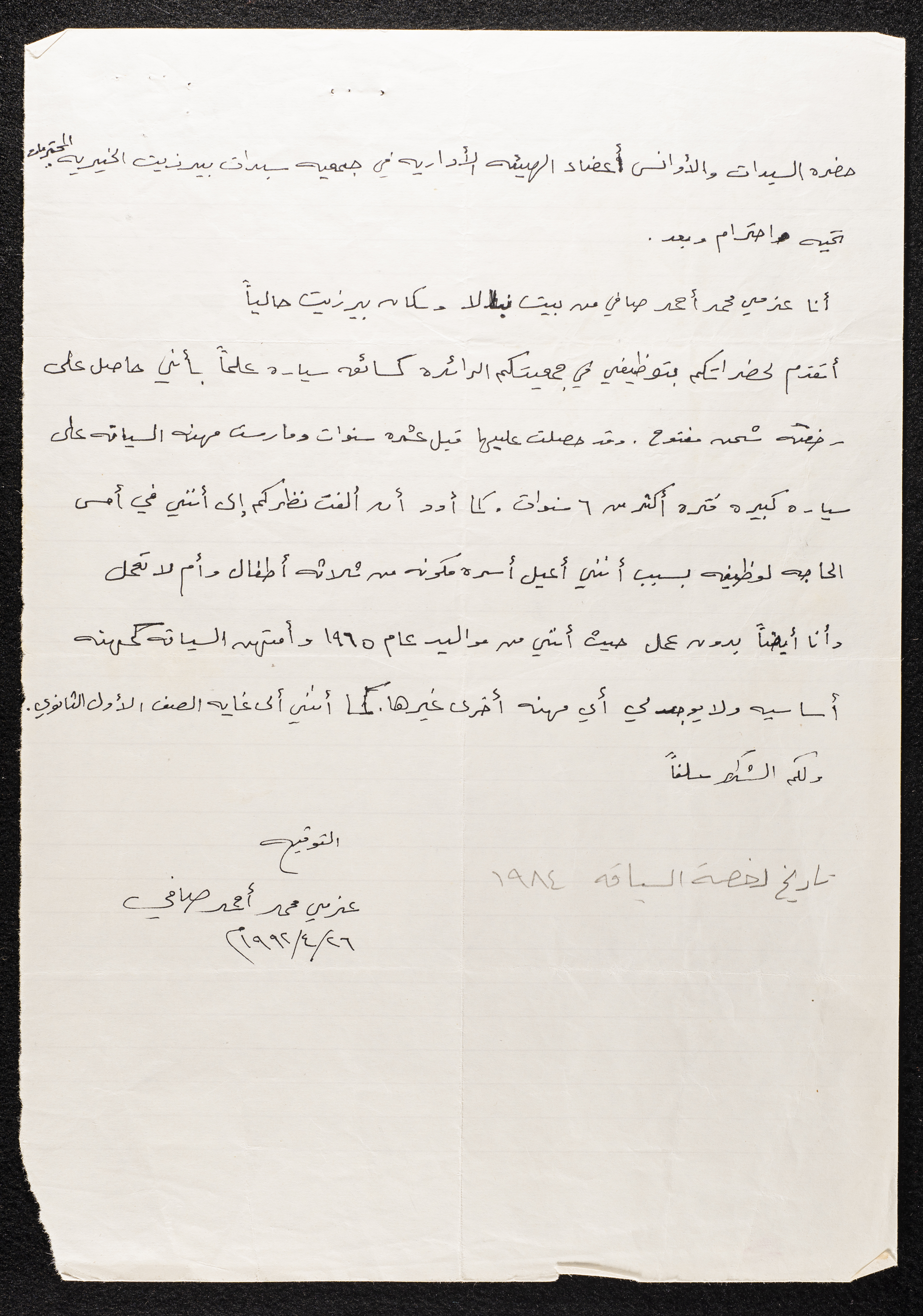 مادة مكتوبة باللغة العربية وهي عبارة عن طلب توظيف في جمعية سيدات بيرزيت الخيرية عام 1992،وُجِدت في مجموعة جمعية سيدات بيرزيت الخيرية.