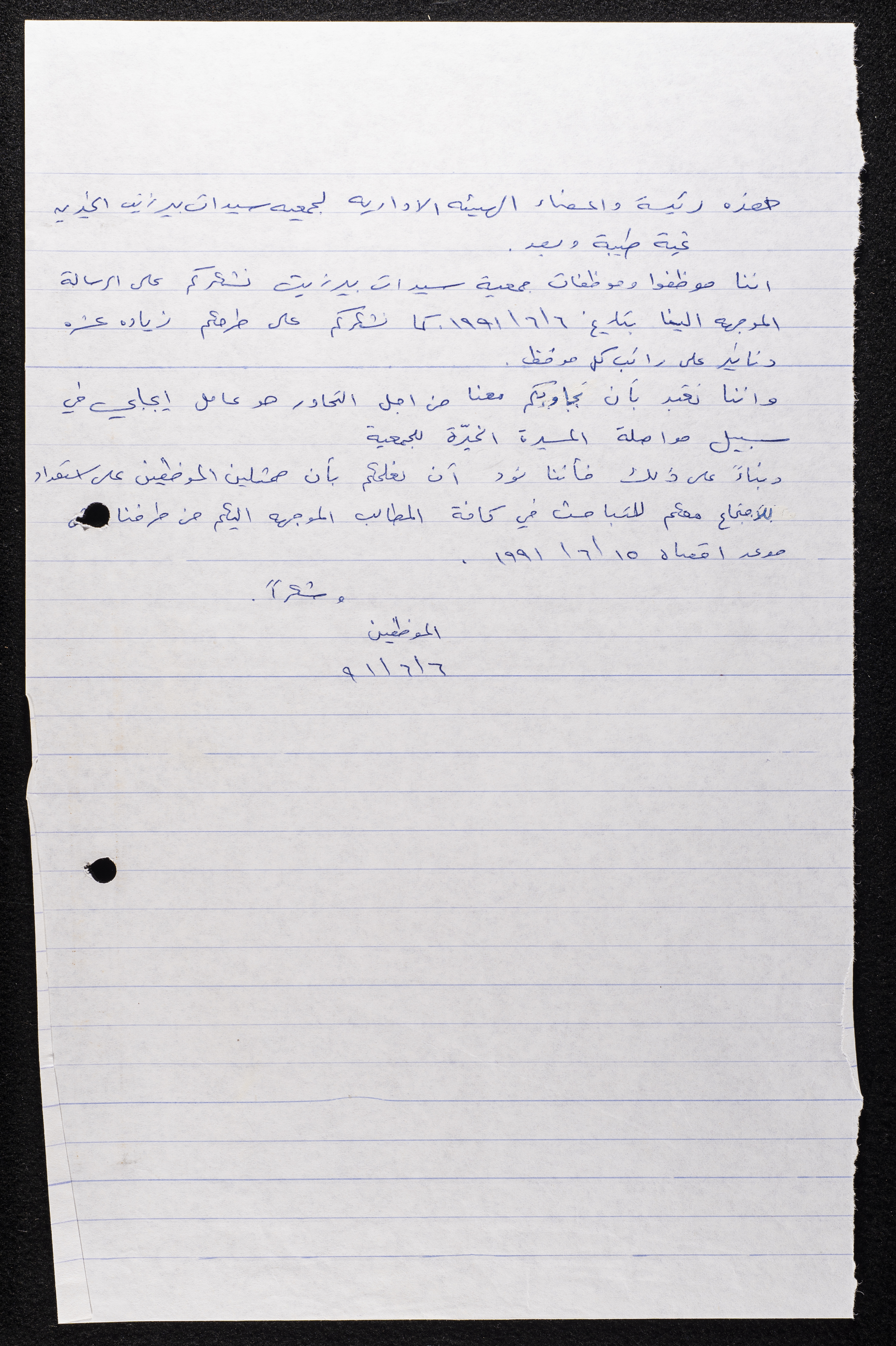 مادة مكتوبة باللغة العربية وهي عبارة عن رسالة الى جمعية سيدات بيرزيت الخيرية عام 1991،وُجِدت في مجموعة جمعية سيدات بيرزيت الخيرية.