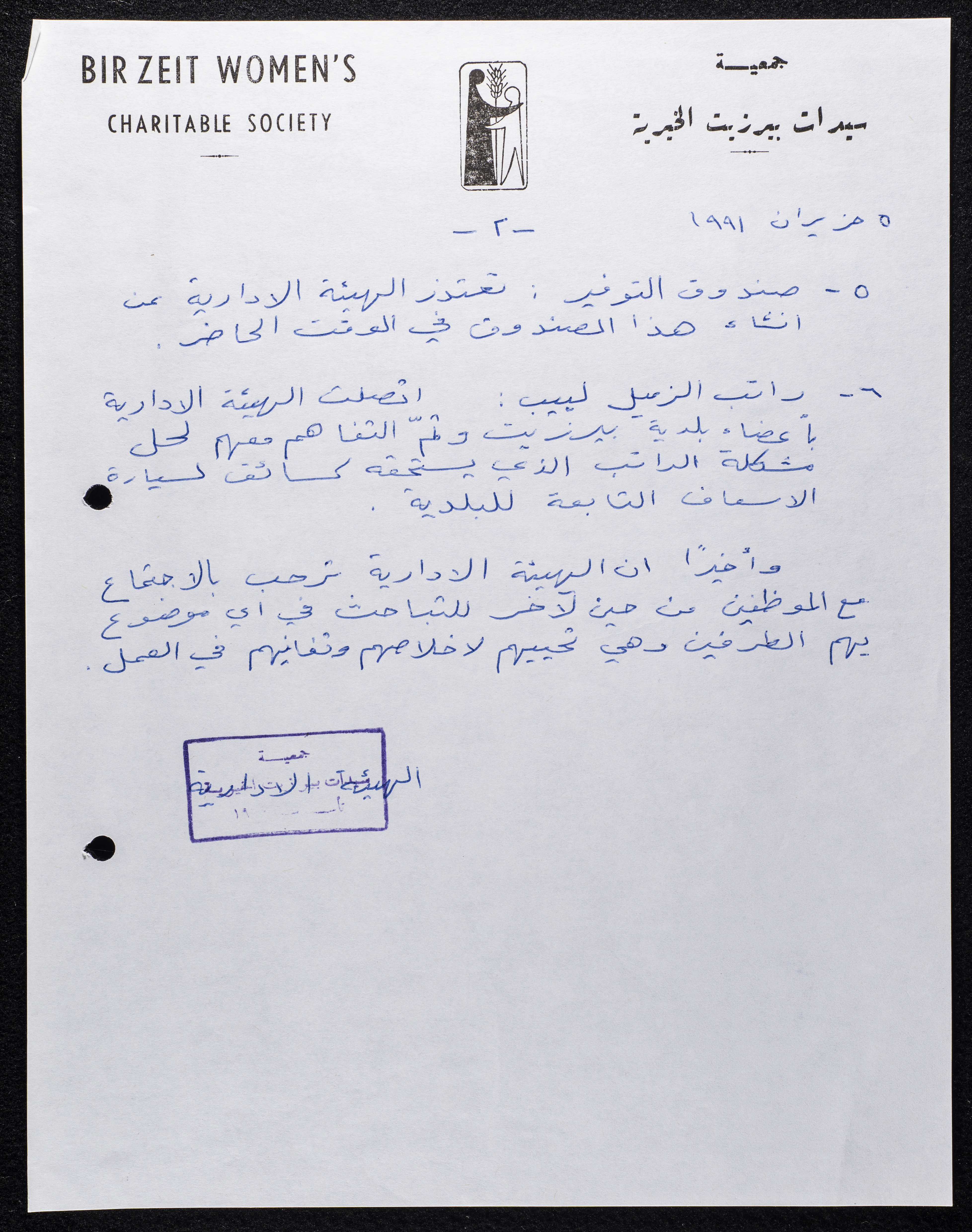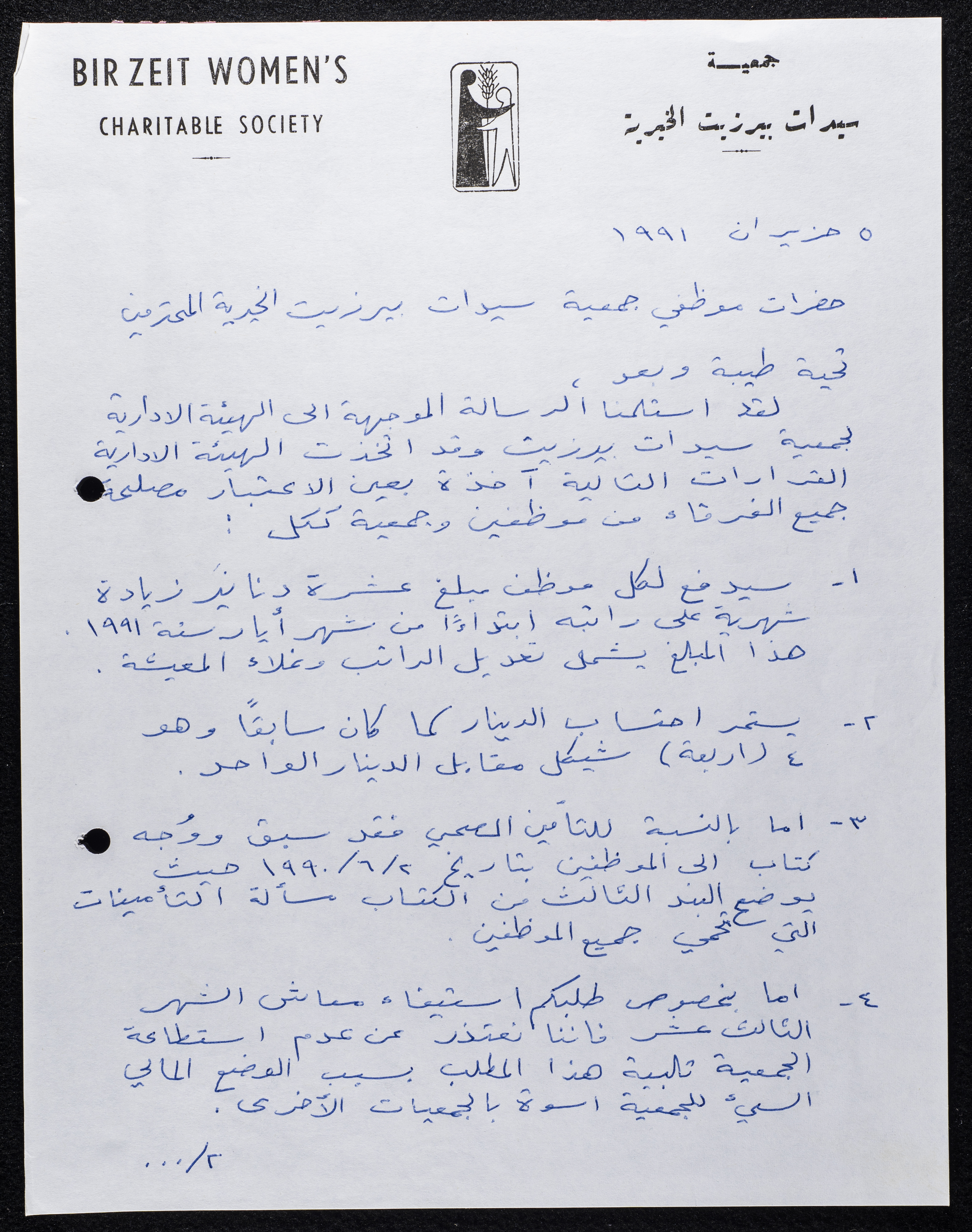 مادة مكتوبة باللغة العربية وهي عبارة عن رسالة صادرة عن جمعية سيدات بيرزيت الخيرية عام 1991،وُجِدت في مجموعة جمعية سيدات بيرزيت الخيرية.