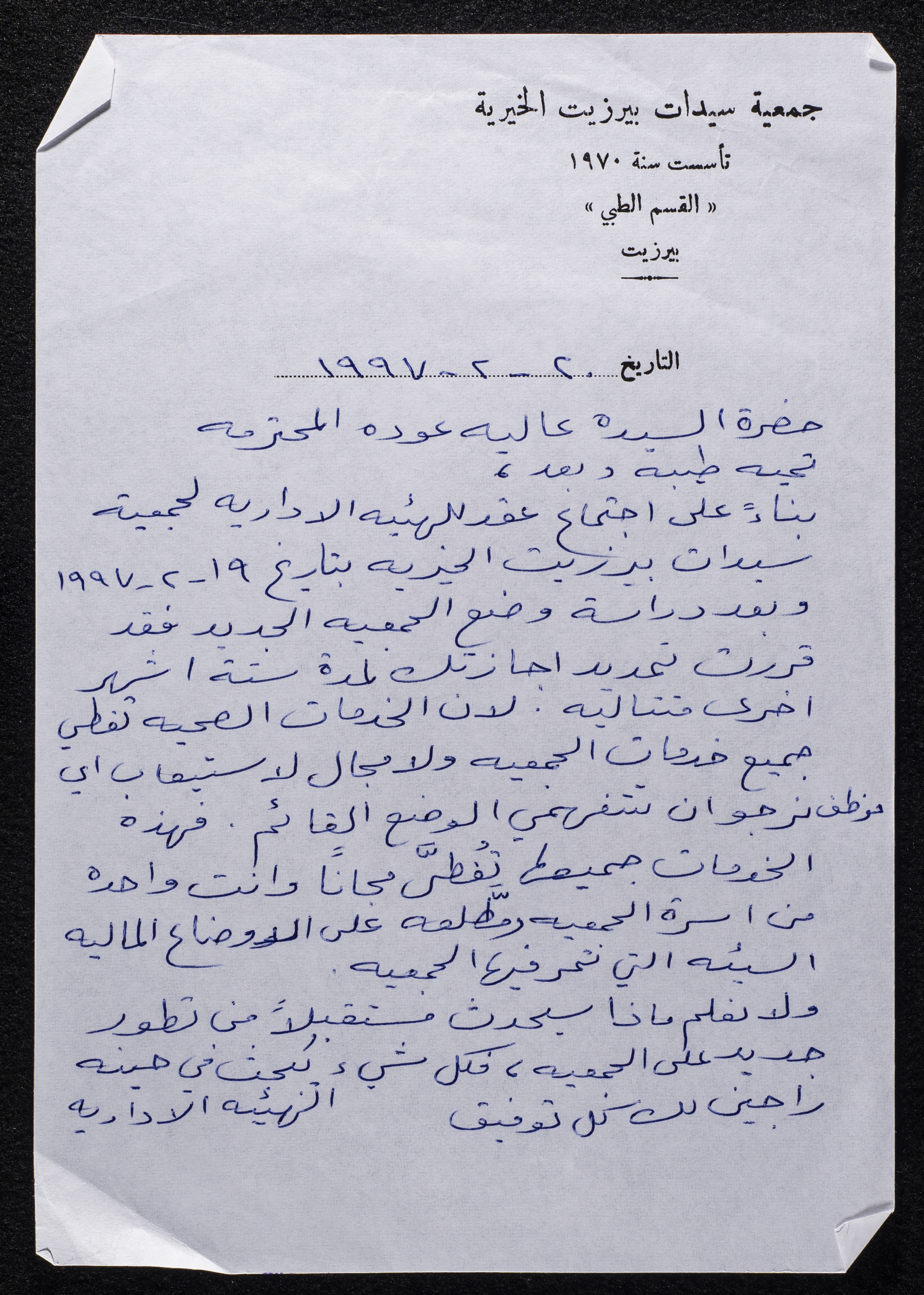 مادة مكتوبة باللغة العربية وهي عبارة عن رسالة صادرة عن القسم الطبي لجمعية سيدات بيرزيت الخيرية عام 1997،وُجِدت في مجموعة جمعية سيدات بيرزيت الخيرية.