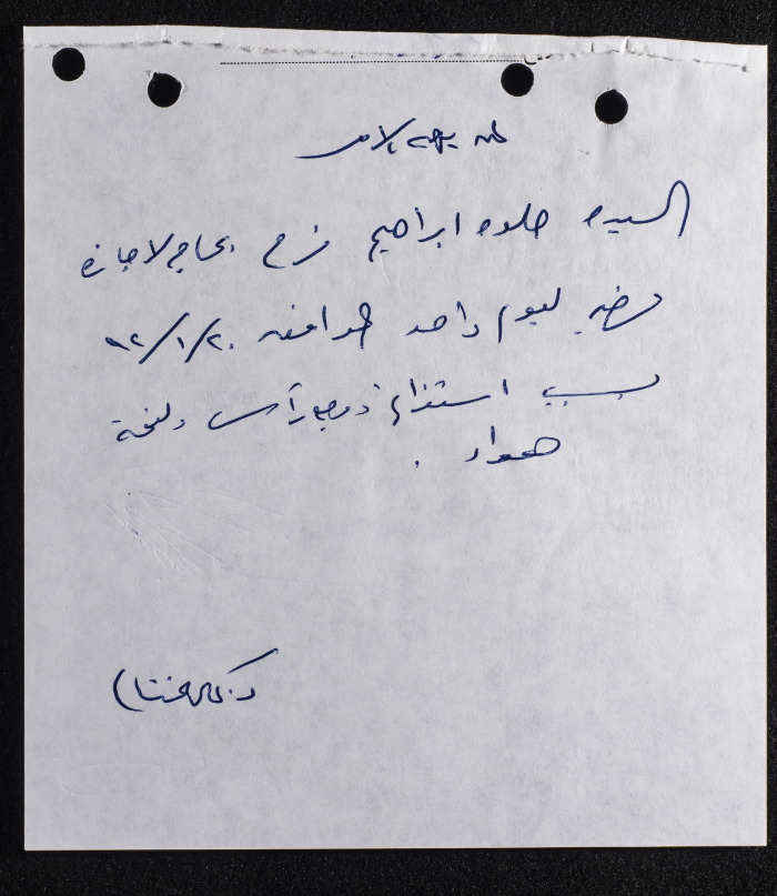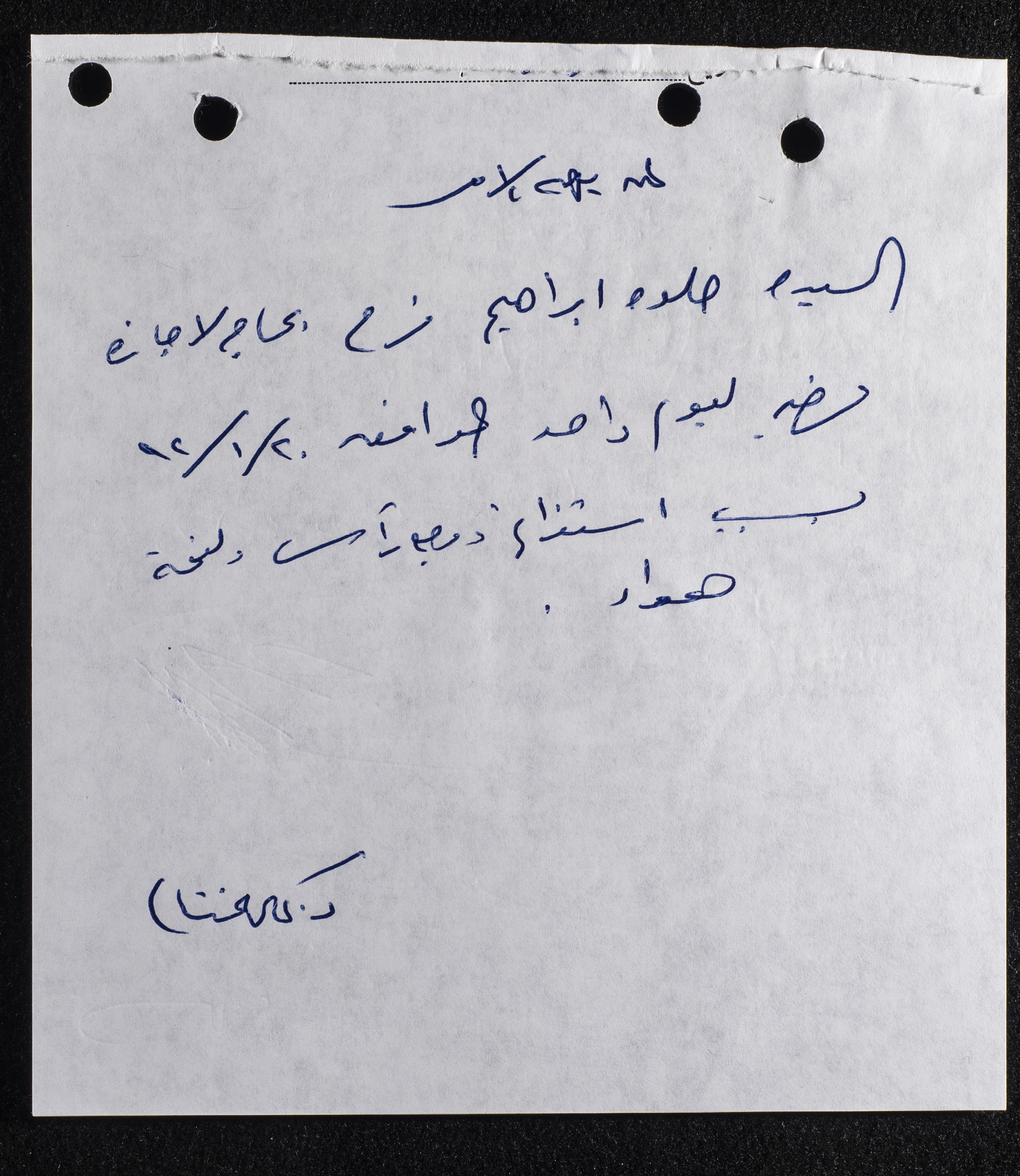 "طلب إجازة"رسالة من حلوة إبراهيم فرح إلى جمعية سيدات بيرزيت الخيرية بتاريخ 20 كانون الثاني 1992