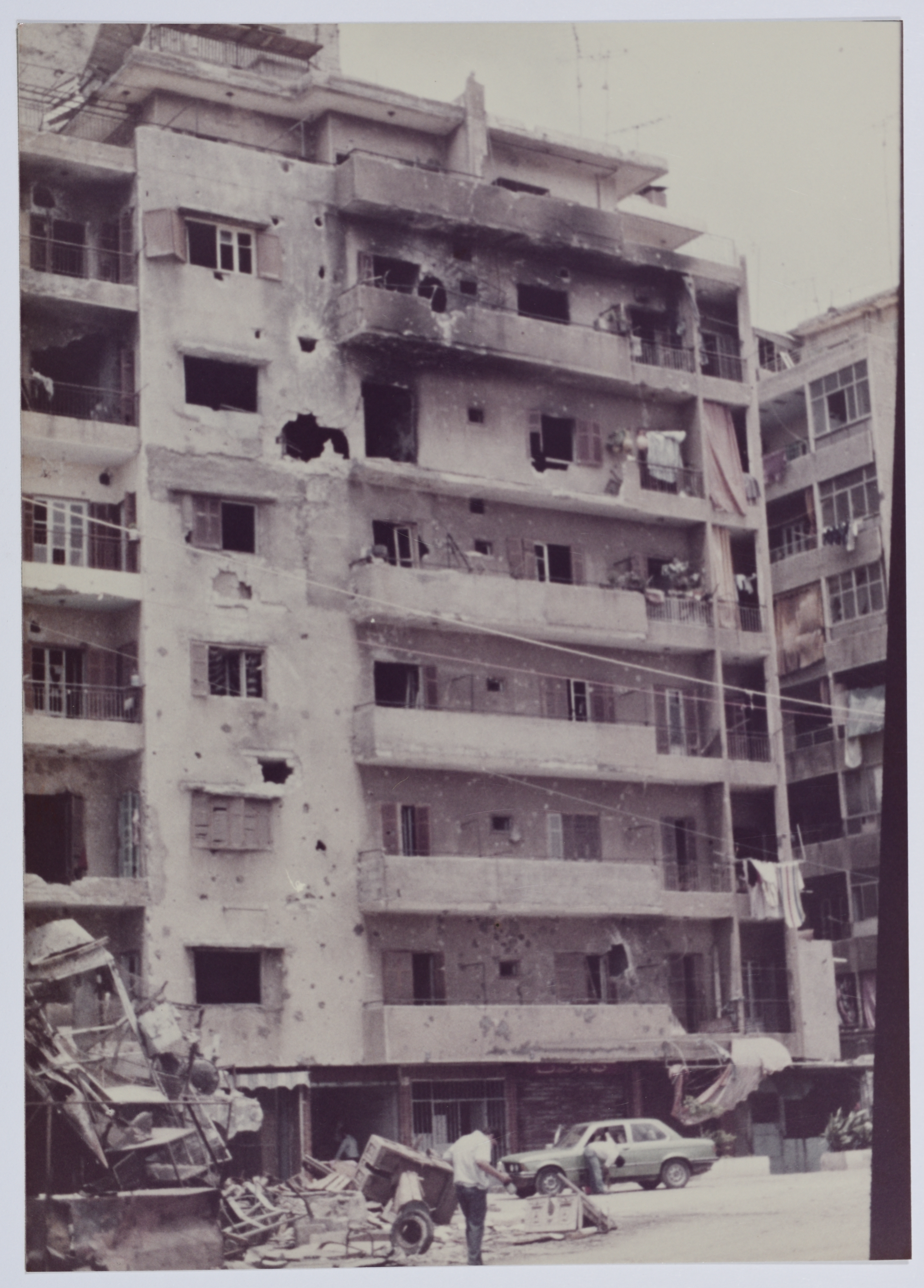 Taken in 1985, this photograph shows the trail of destruction of a Palestinian refugee camp in Beirut due to bombardment in the course of the War of the Camps.