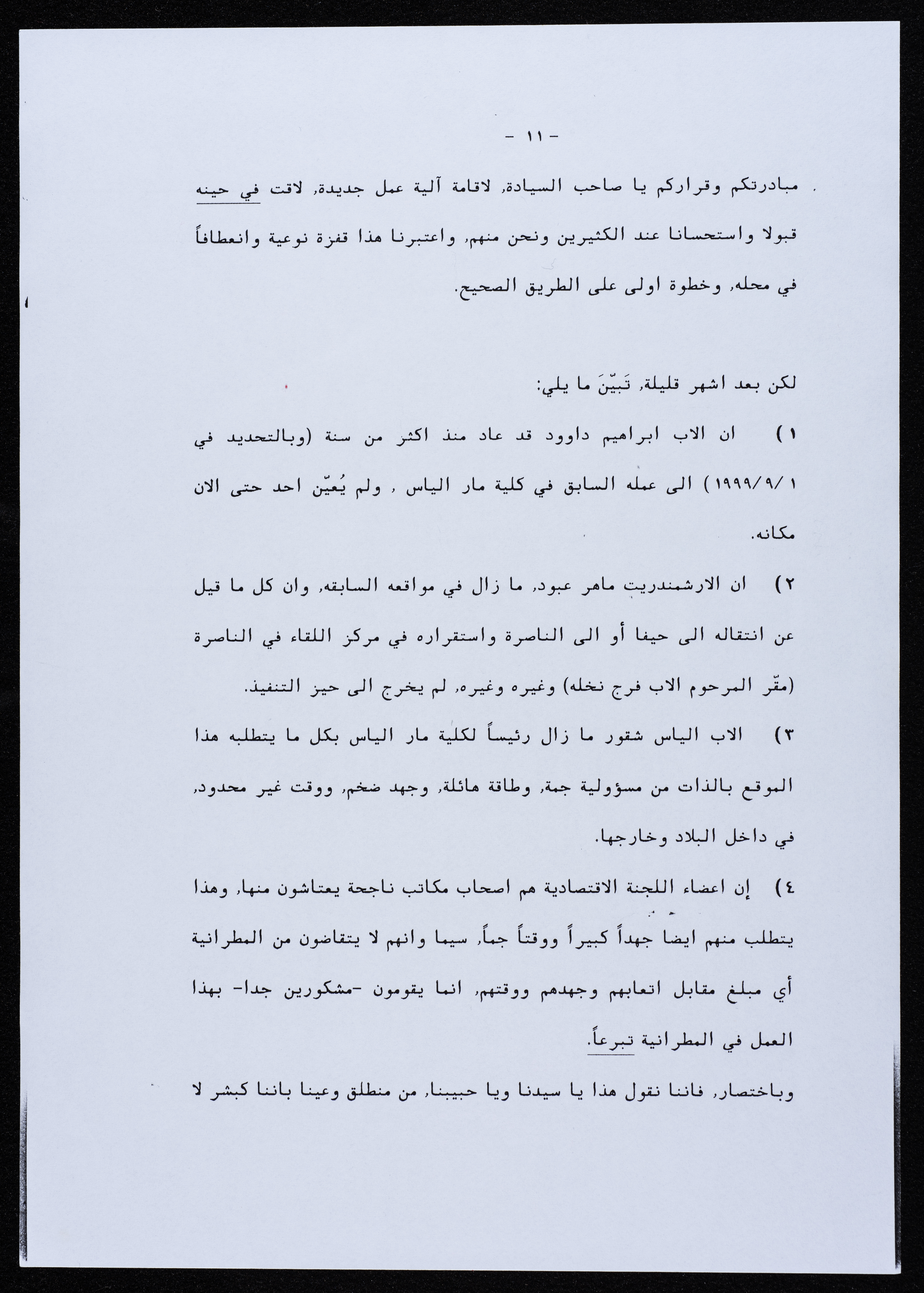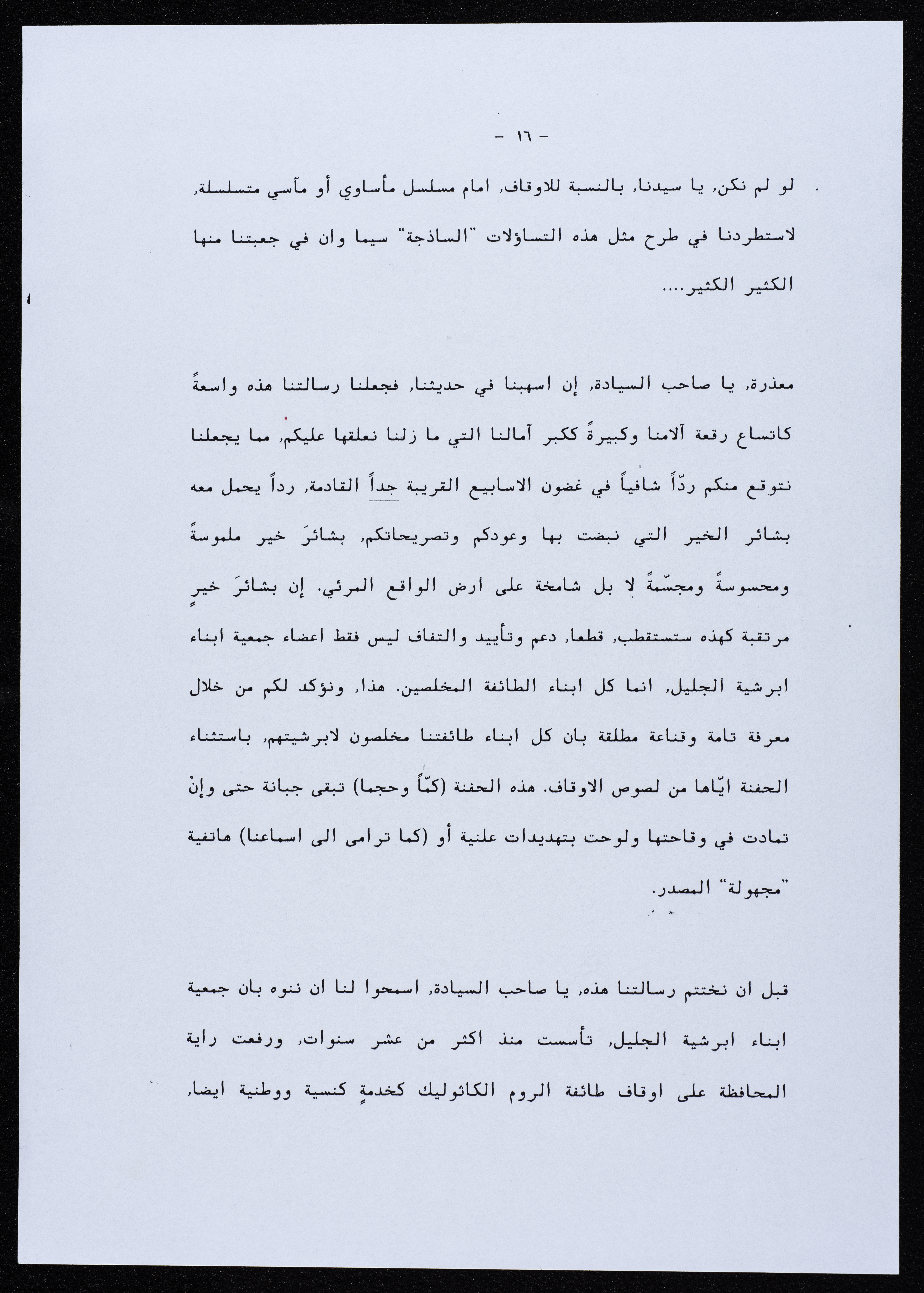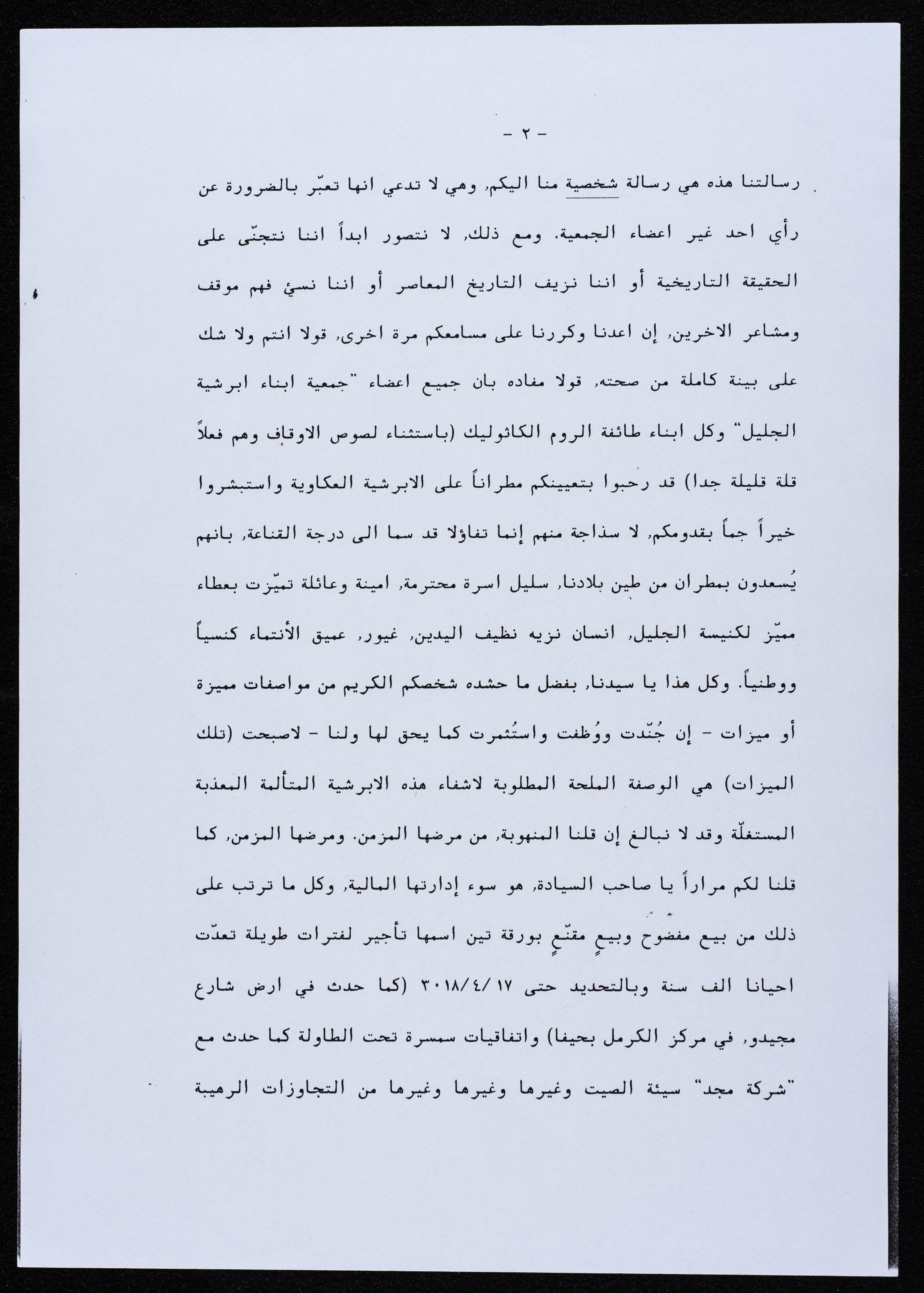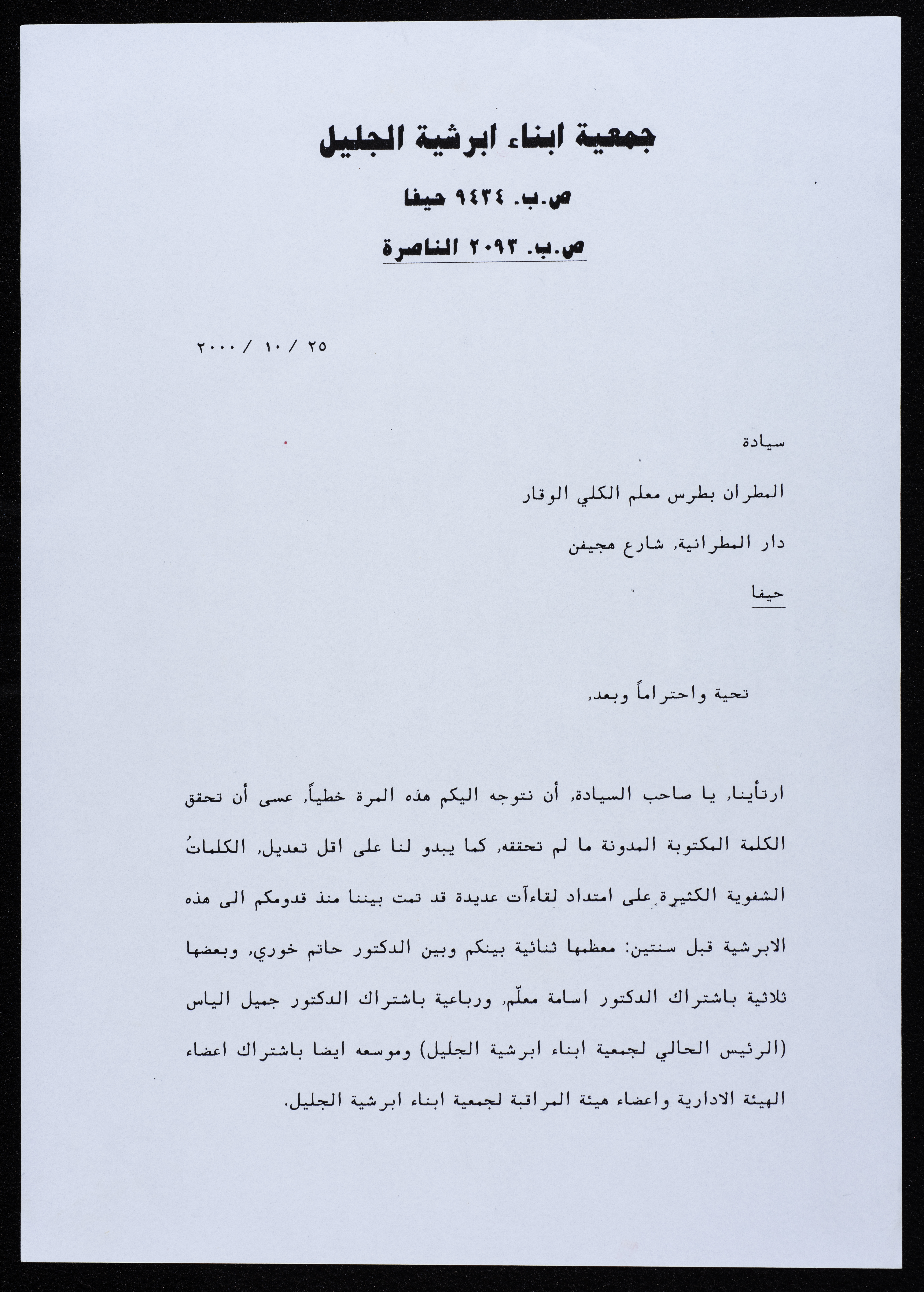 رسالة موجهة من جمعية أبناء أبرشية الجليل إلى المطران بطرس المعلم عام 2000.