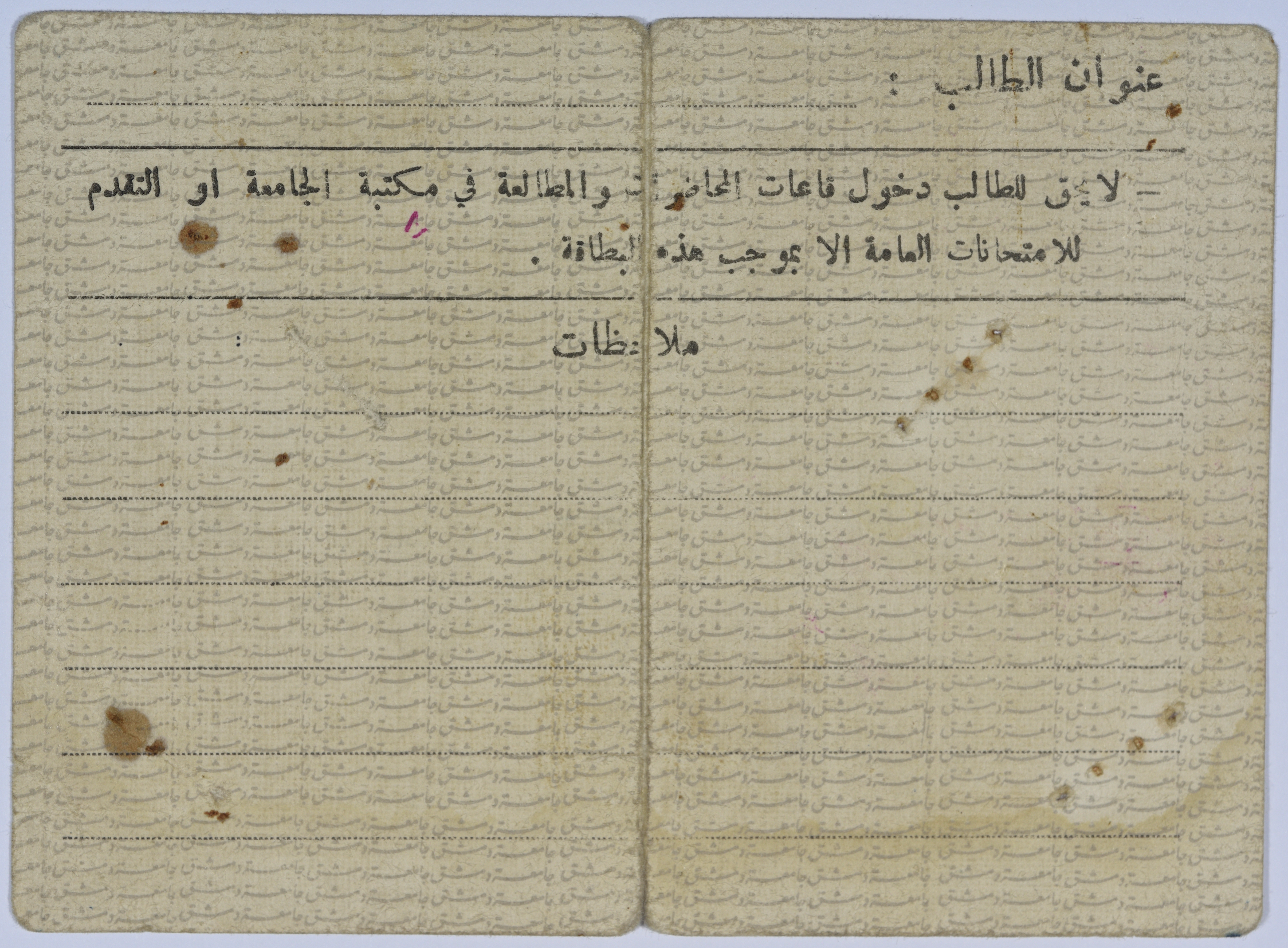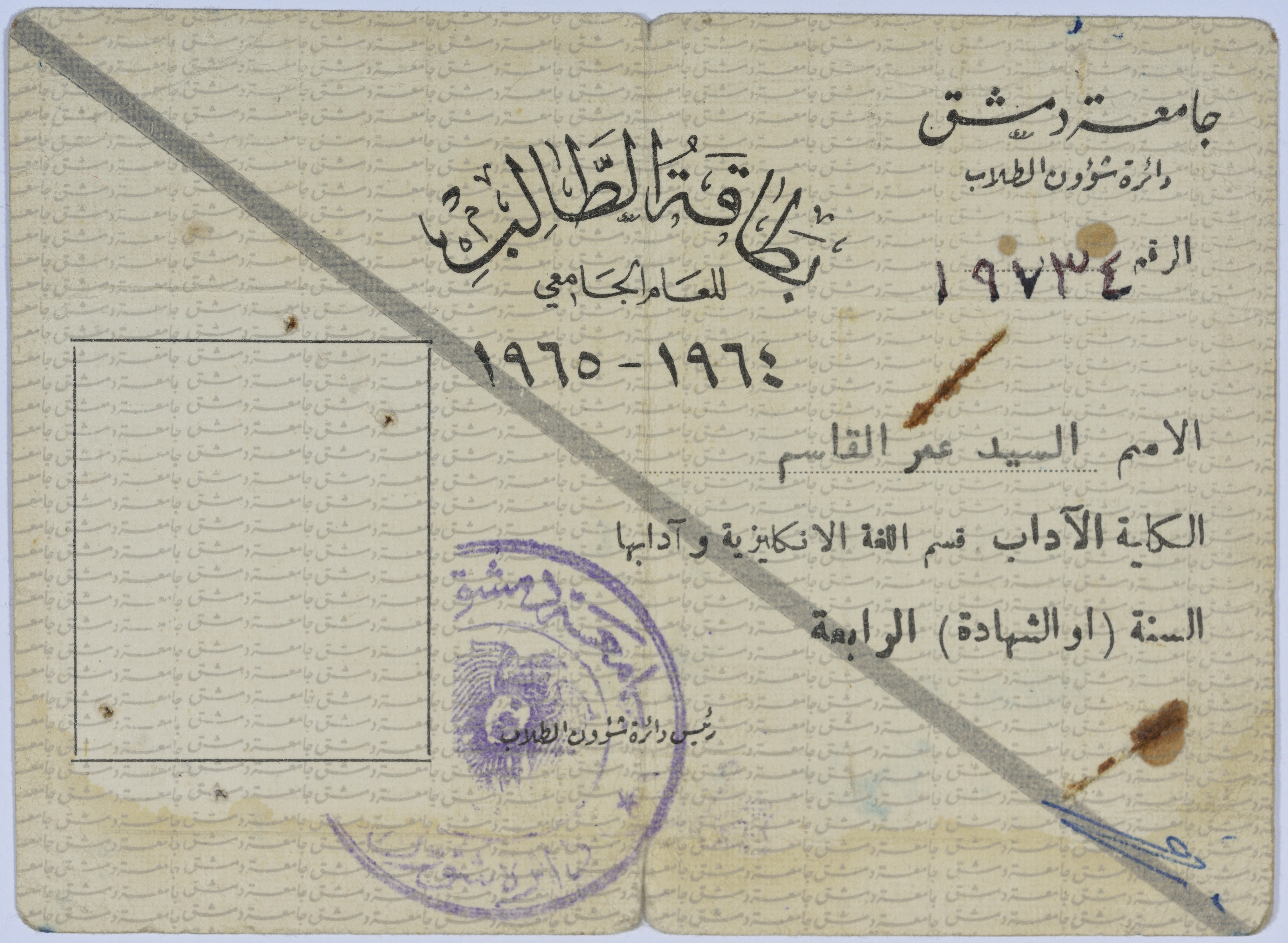 بطاقة طالب جامعي لعمر القاسم صادرة عن جامعة دمشق، 1964