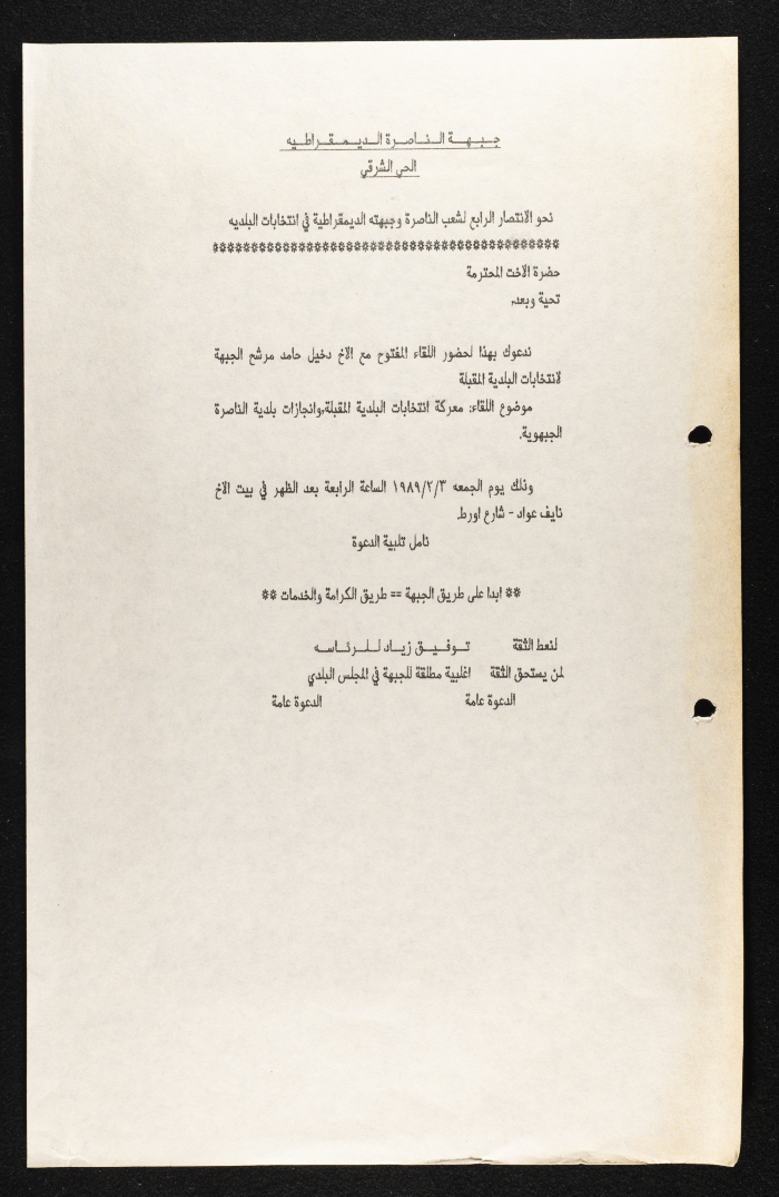 دعوة من حركة النساء الديمقراطيات الناصرة لحضور اللقاء المفتوح مع "دخيل حامد" مرشح الجبهة لانتخابات البلدية المقبلة عام 1989