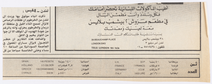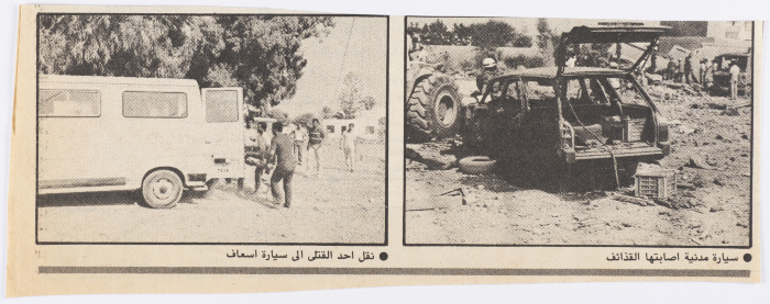قصاصة من عدد من جريدة القبس صادر في تشرين الأول 1985، تحتوي على صورة بعنوان "سيارة مدنية أصابتها القذائف" لسيارة أصيبَت بالقذائف وعلى أخرى لجانب من نقل أحد المصابين، في أعقاب الغارة الإسرائيلية على مقرّ منظمة التحرير الفلسطينية، في بلدة حمّام الشط التونسية، بتاريخ 1 تشرين الأول من العام نفسه.
