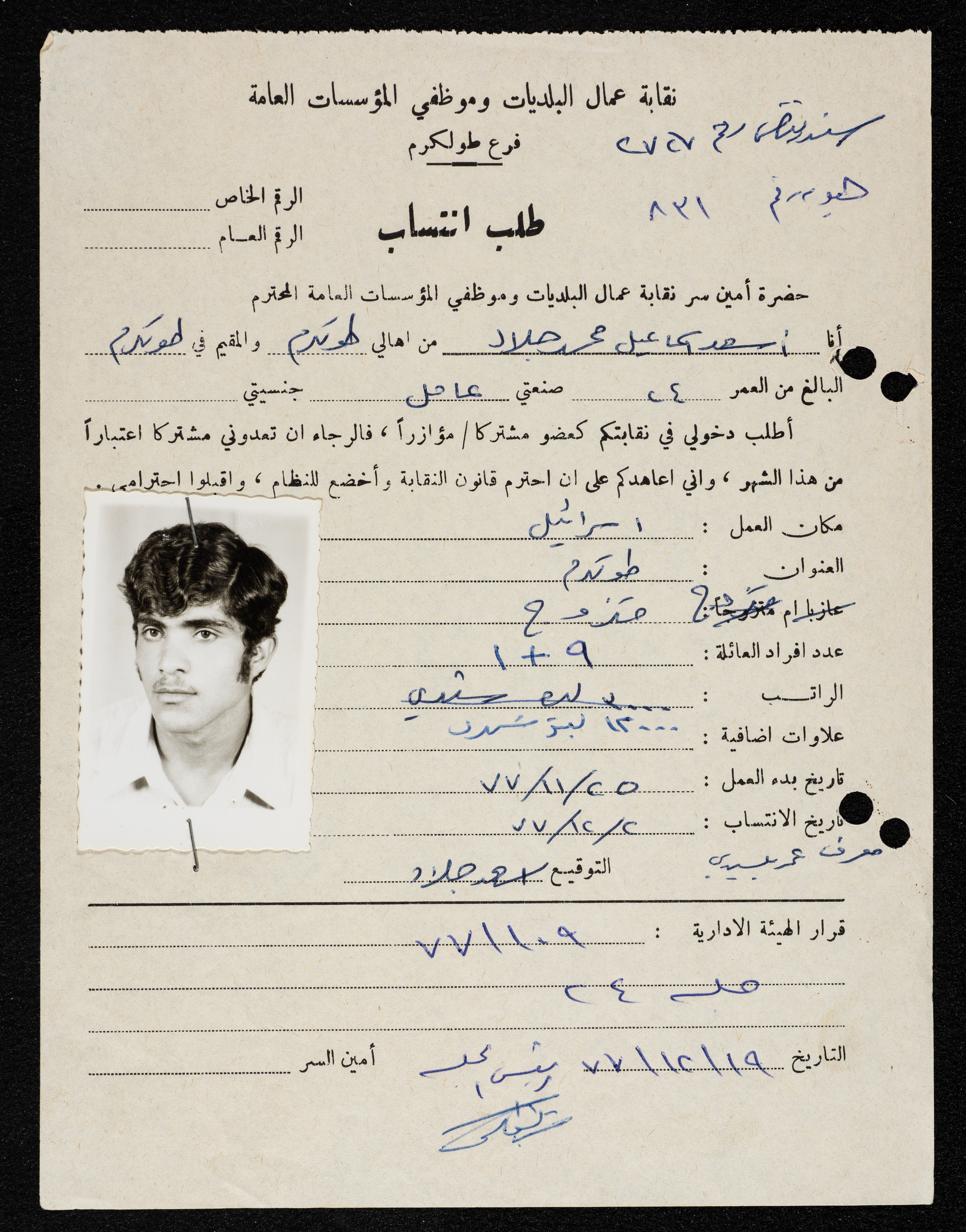 طلب انتساب أسعد إسماعيل محمد جلاد لنقابة عمال البلديات وموظفي المؤسسات العامة في طولكرم، بتاريخ 2 كانون الأول 1977.