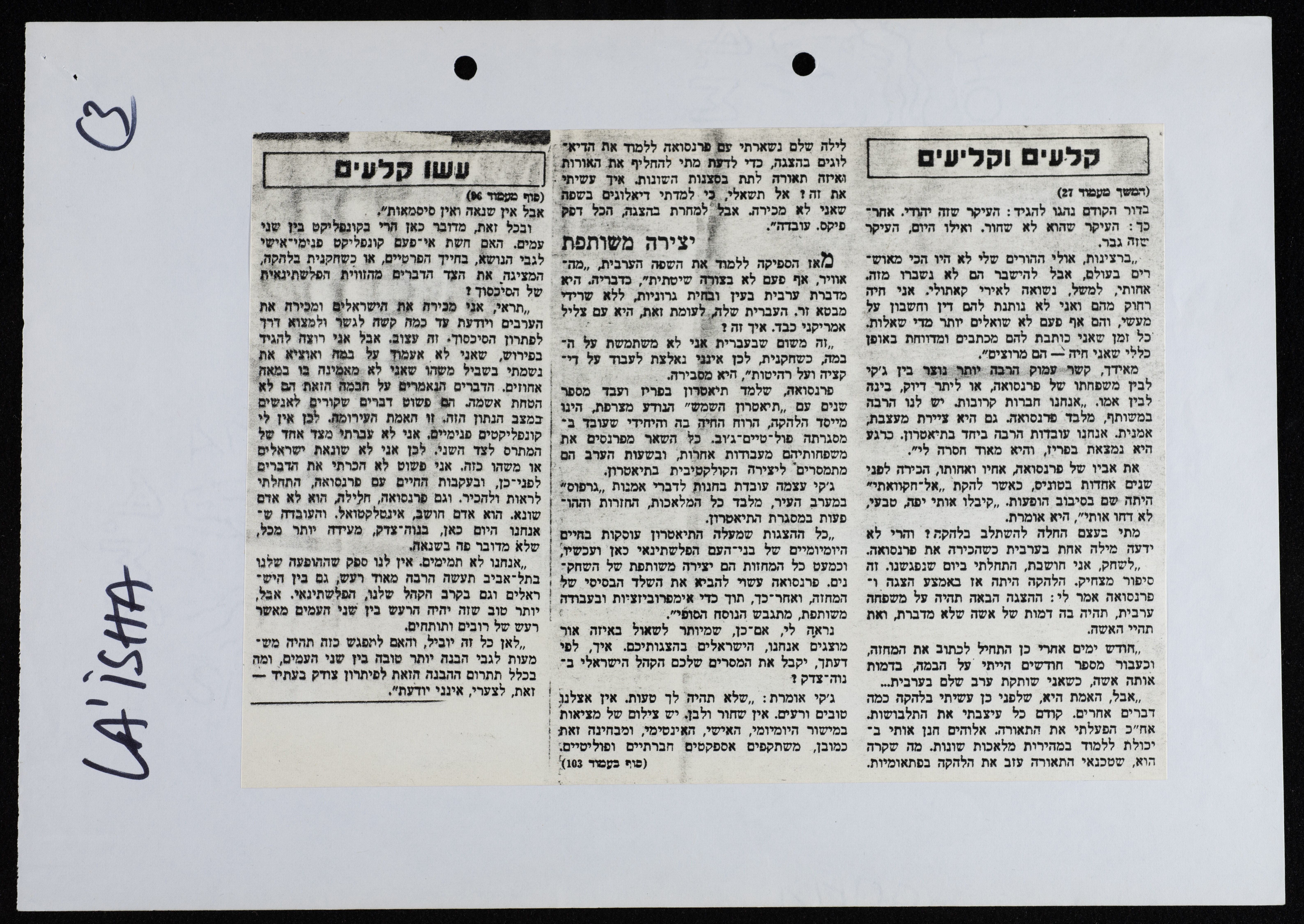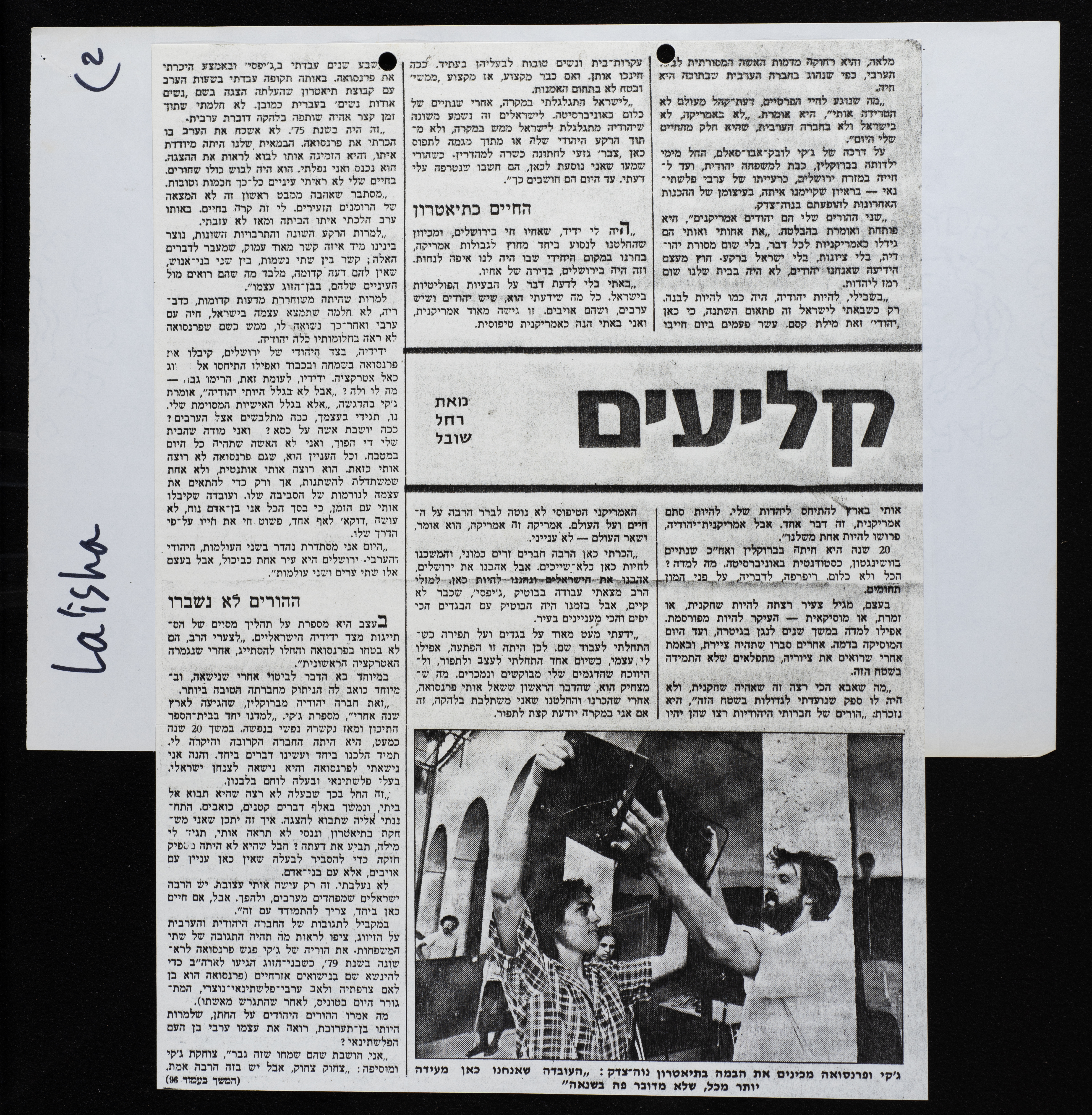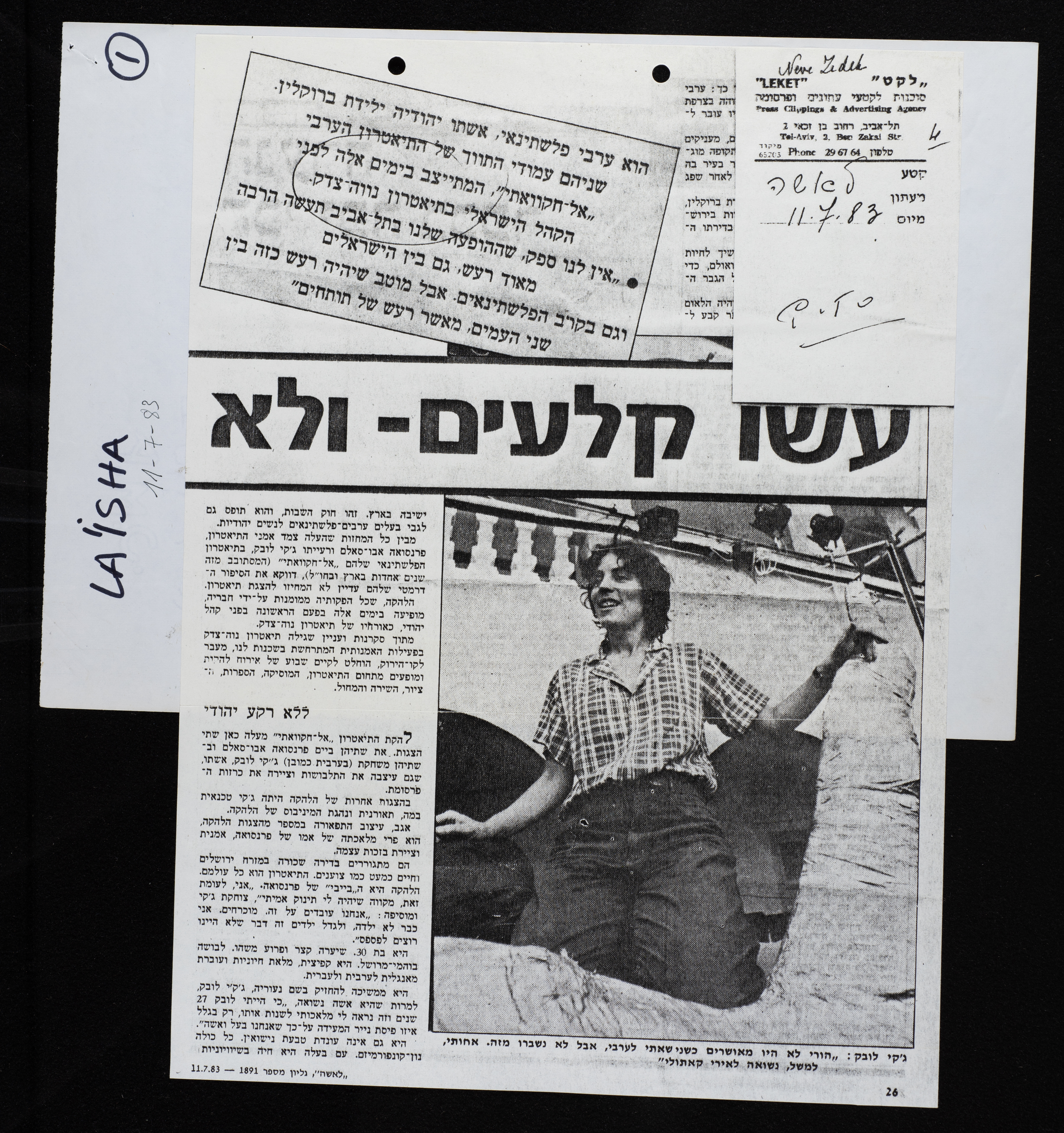 قصاصة من جريدة "لا ايشاه" العبرية، تحتوي على تقرير صحفي يتحدث عن مسرح الحكواتي.
