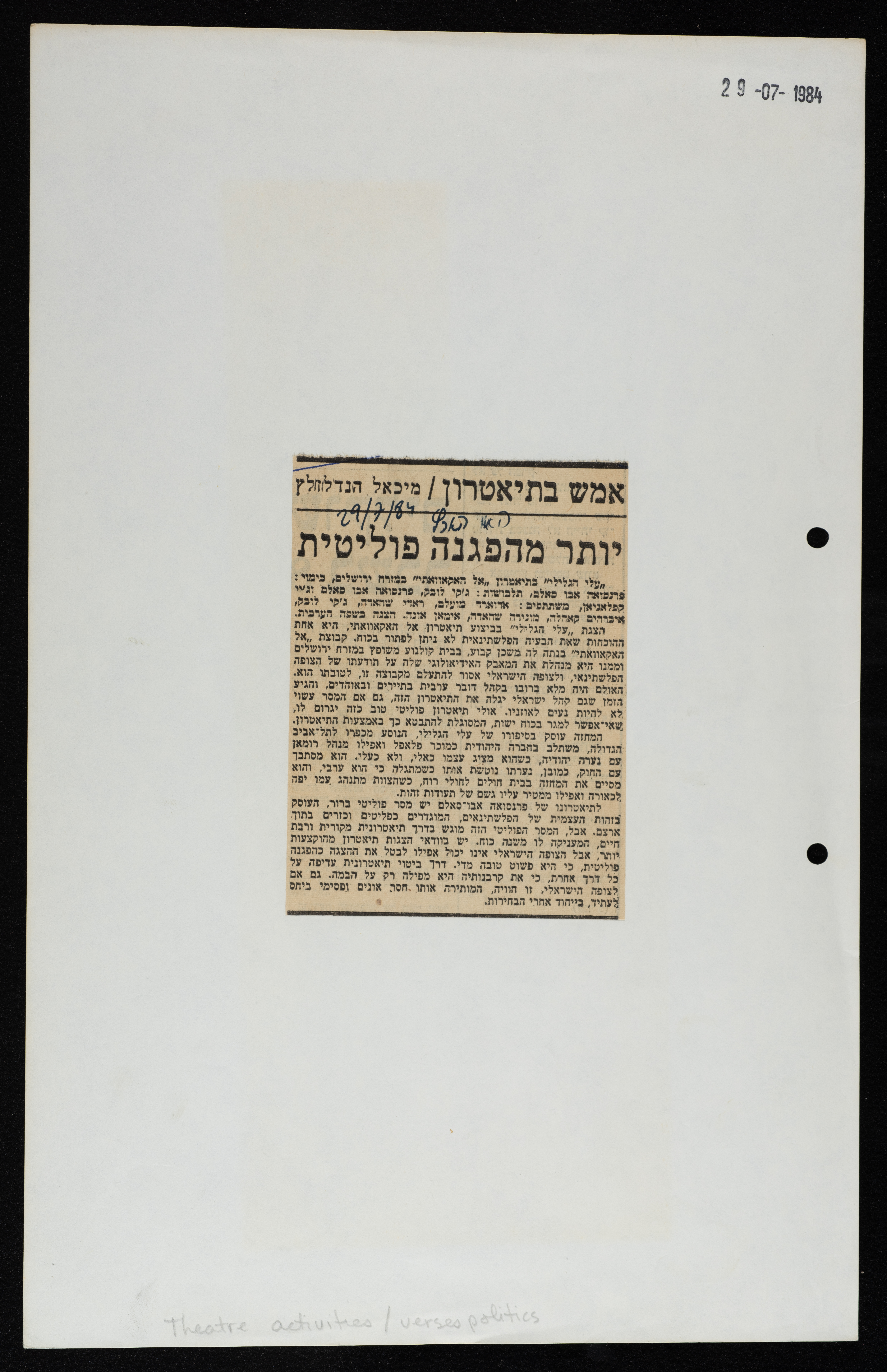 قصاصة من جريدة "هآرتس" العبرية، تحتوي على تقرير صحفي بعنوان: "أكثر من مظاهرة فلسطينية"، يتحدث عن مسرح الحكواتي، ومسرحية "علي الجليلي".