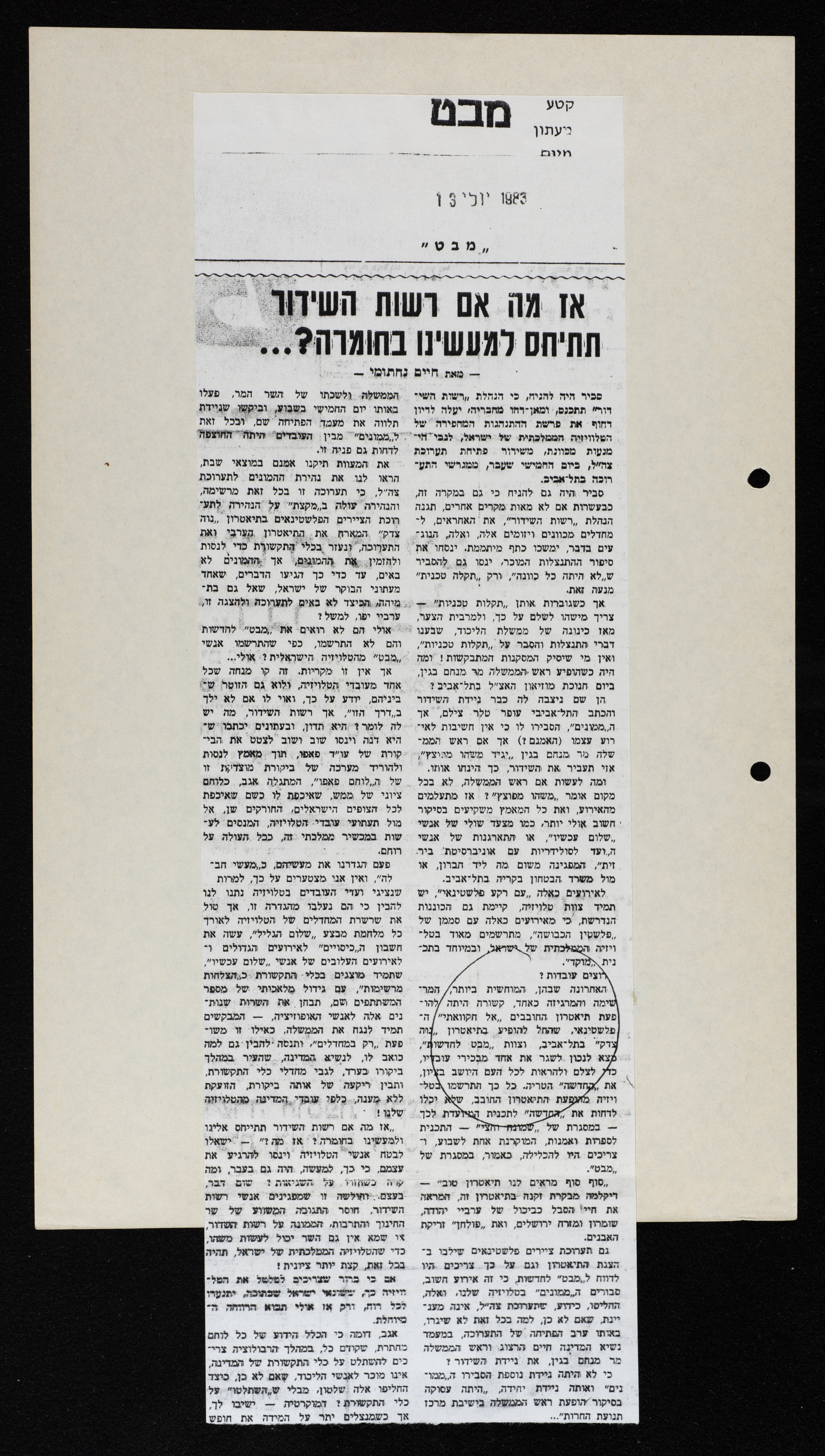 Dated July 13, 1983, this newspaper clipping in Hebrew is an opinion piece on El-Hakawati Theatre penned by the Israeli writer Chaim Nakhtumi.