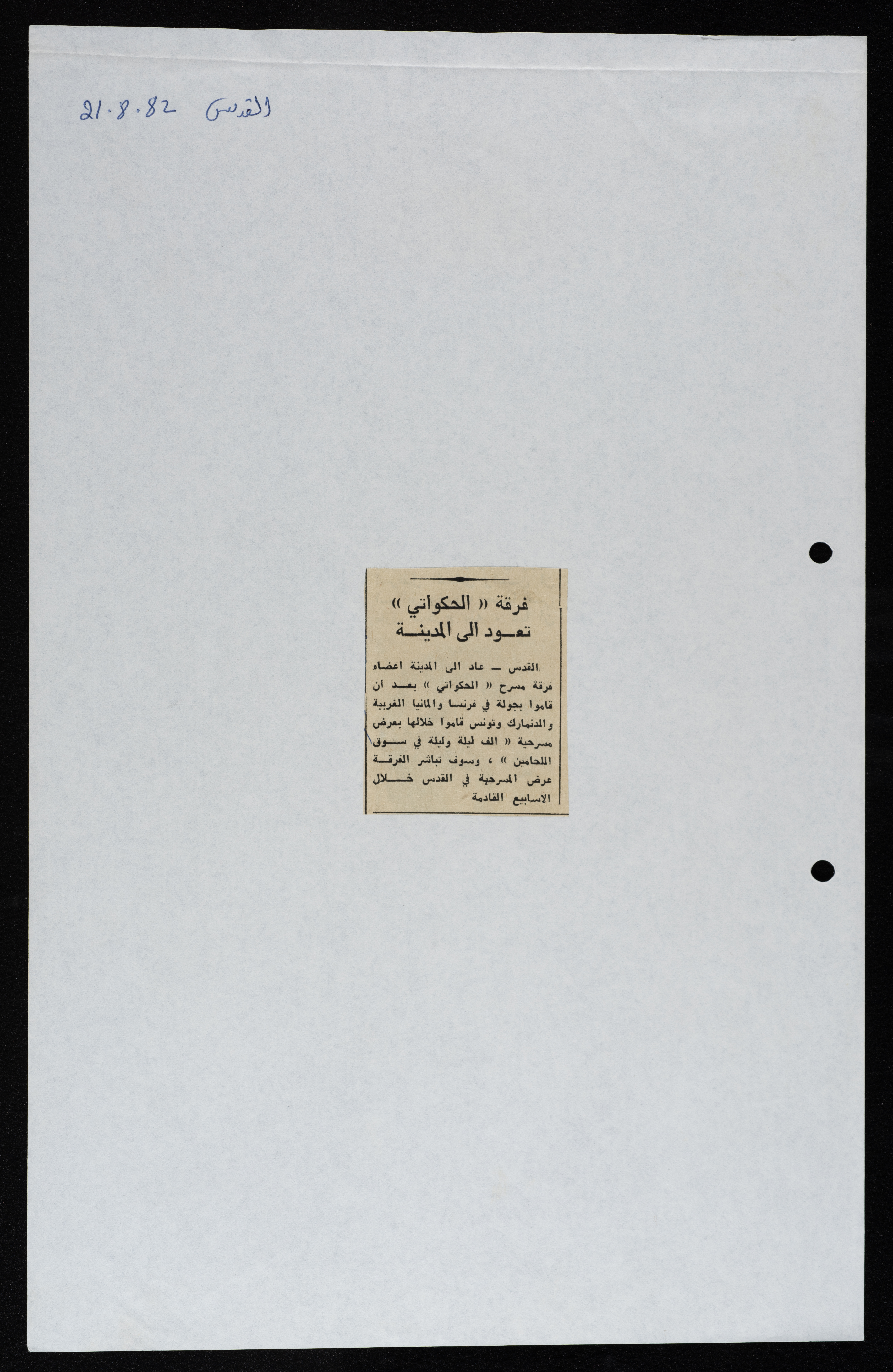 قصاصة من جريدة القدس تتضمن خبراً عن عودة فرقة الحكواتي إلى القدس بعد جولة فنية في فرنسا وألمانيا والدنمارك وتونس عام 1982.