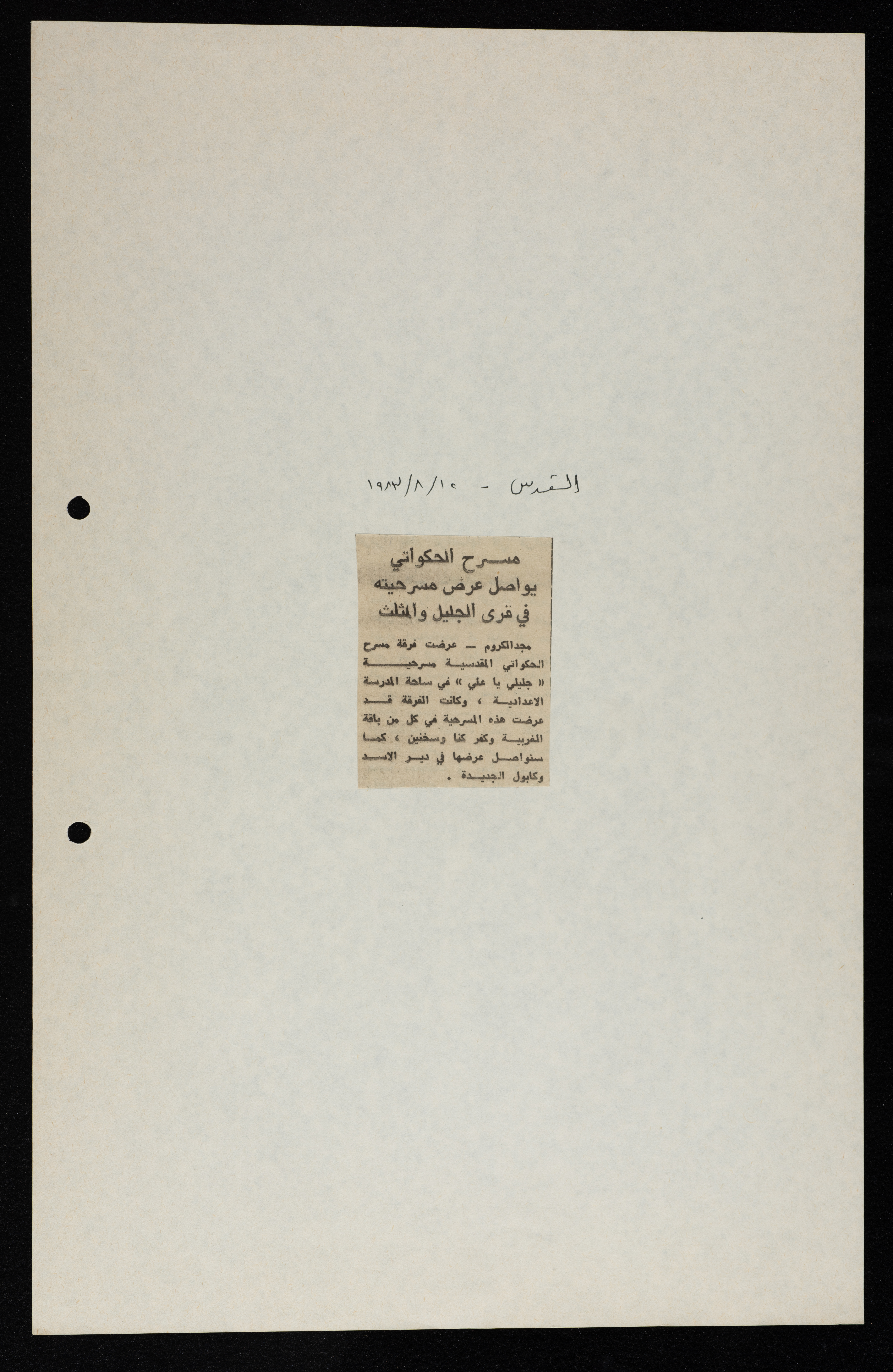 قصاصة من جريدة القدس، "مسرح الحكواتي يواصل عرض مسرحيته في قرى الجليل والمثلث”، 12/8/1983