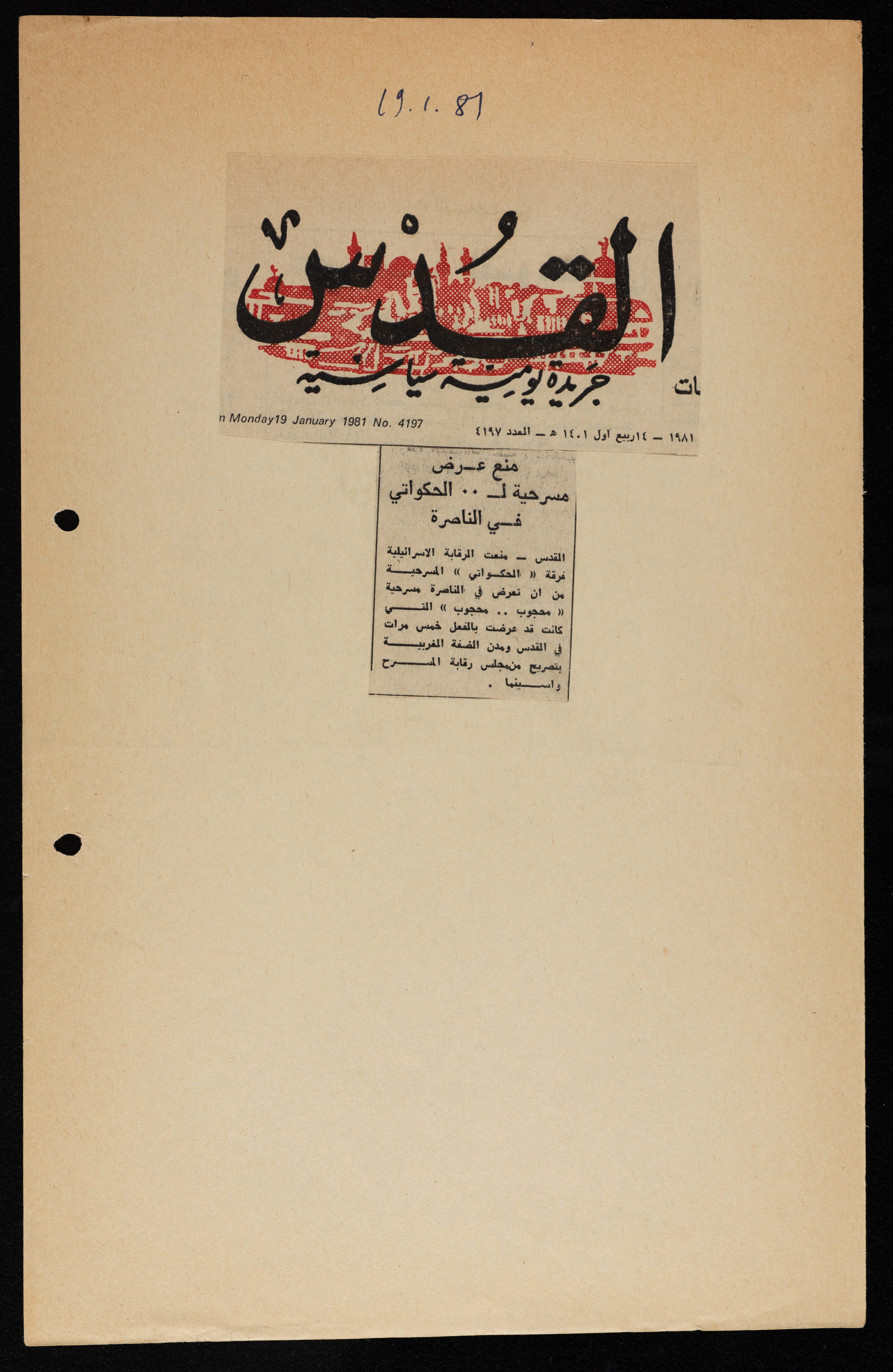 قصاصة من جريدة القدس، “منع عرض مسرحية للحكواتي في الناصرة "، 19/1/1981