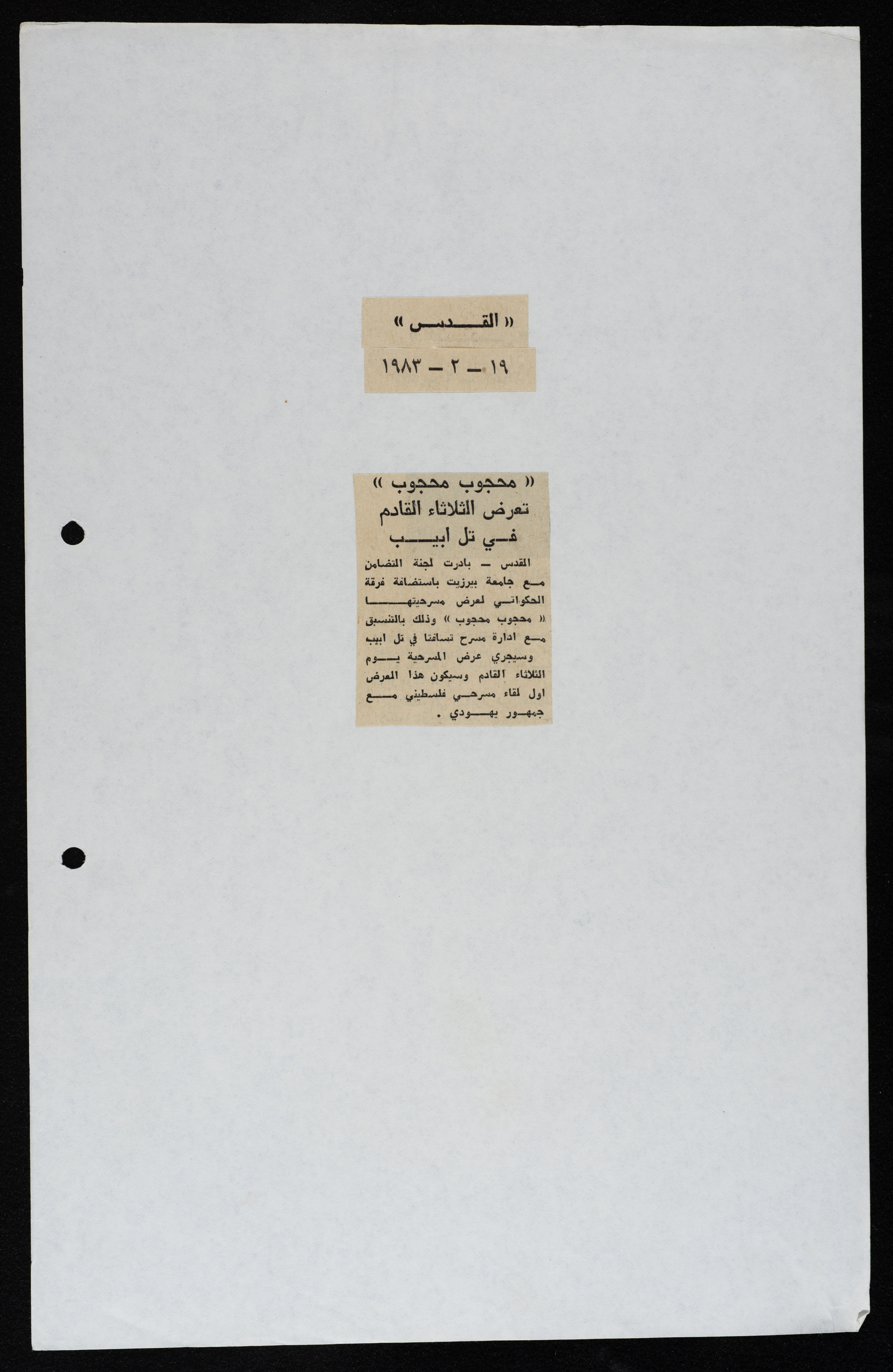 قصاصة من جريدة القدس تتضمن خبراً عن عرض مسرحية "محجوب محجوب" لمسرح الحكواتي في تل أبيب عام 1983.